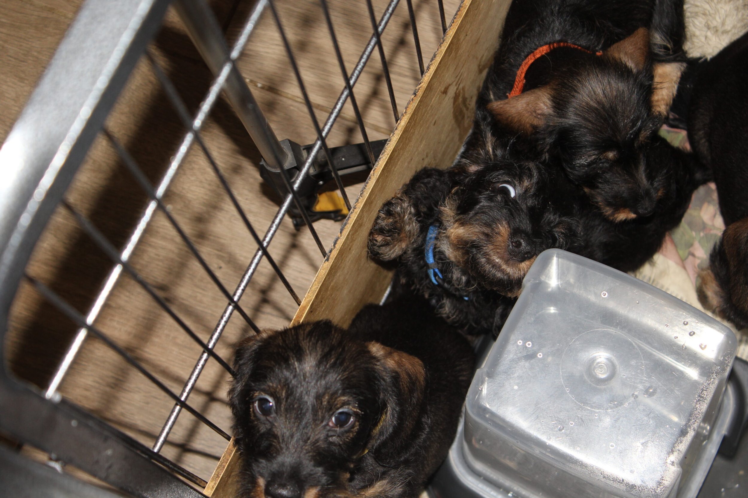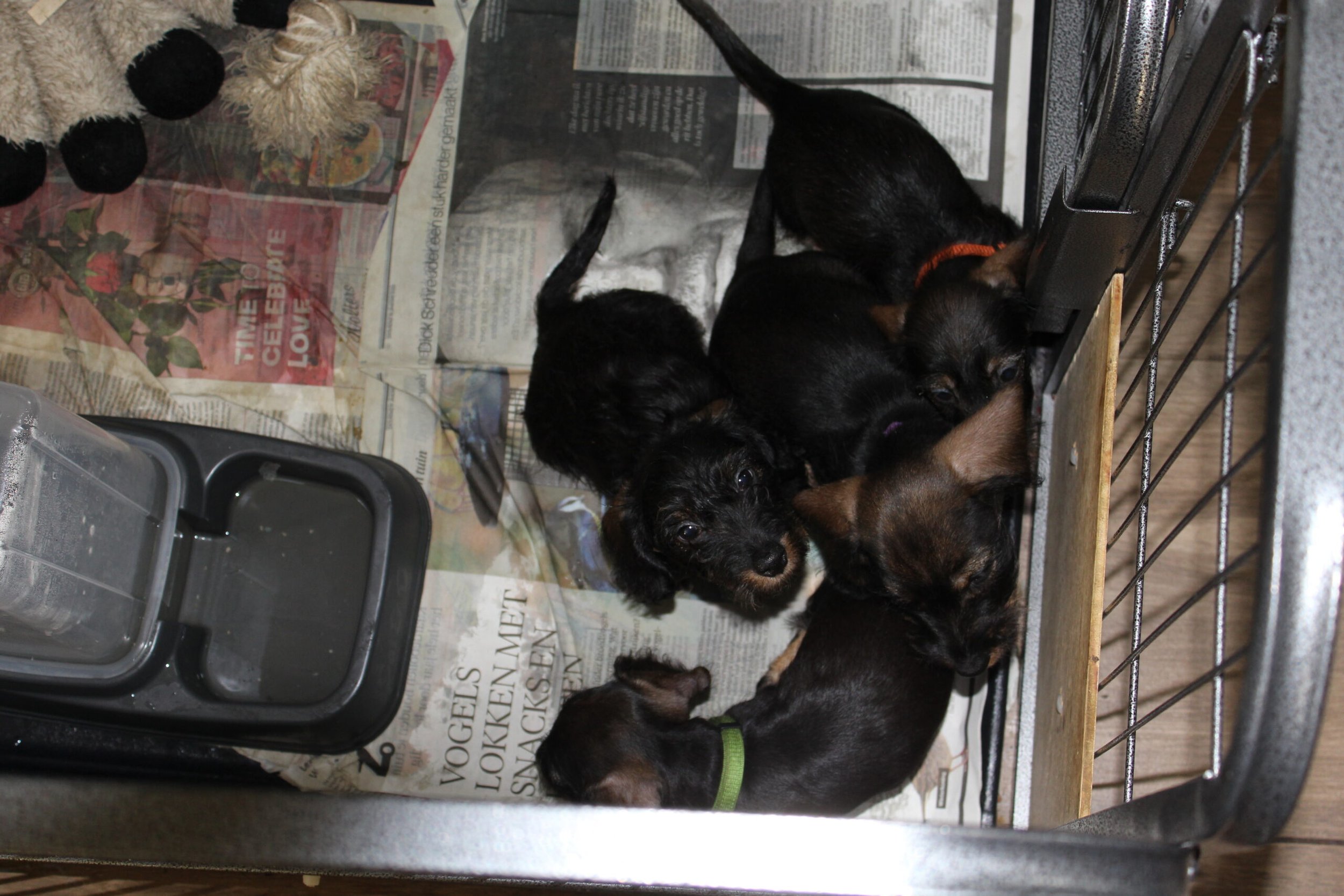 Ze houden ons goed bezig nu ze wereld buiten de werpkist en de kamerkennel aan het ontdekken zijn. Snoeren en loszittende dingen moeten goed verstopt worden, daar de kleine, venijnige tandjes buiten de oortjes en staartjes van zusjes en broertjes graag ergens ingezet worden. Ook bezoekers hebben al mogen ervaren dat veters ook razendsnel worden losgetrokken. Ja het is een drukte van jewelste in huize Aan den Voorhoeve. Het is met recht intens genieten, maar zeker ook vermoeiend, maar dat hoort erbij en het is geweldig om te zien hoe ze zich ontwikkelen.