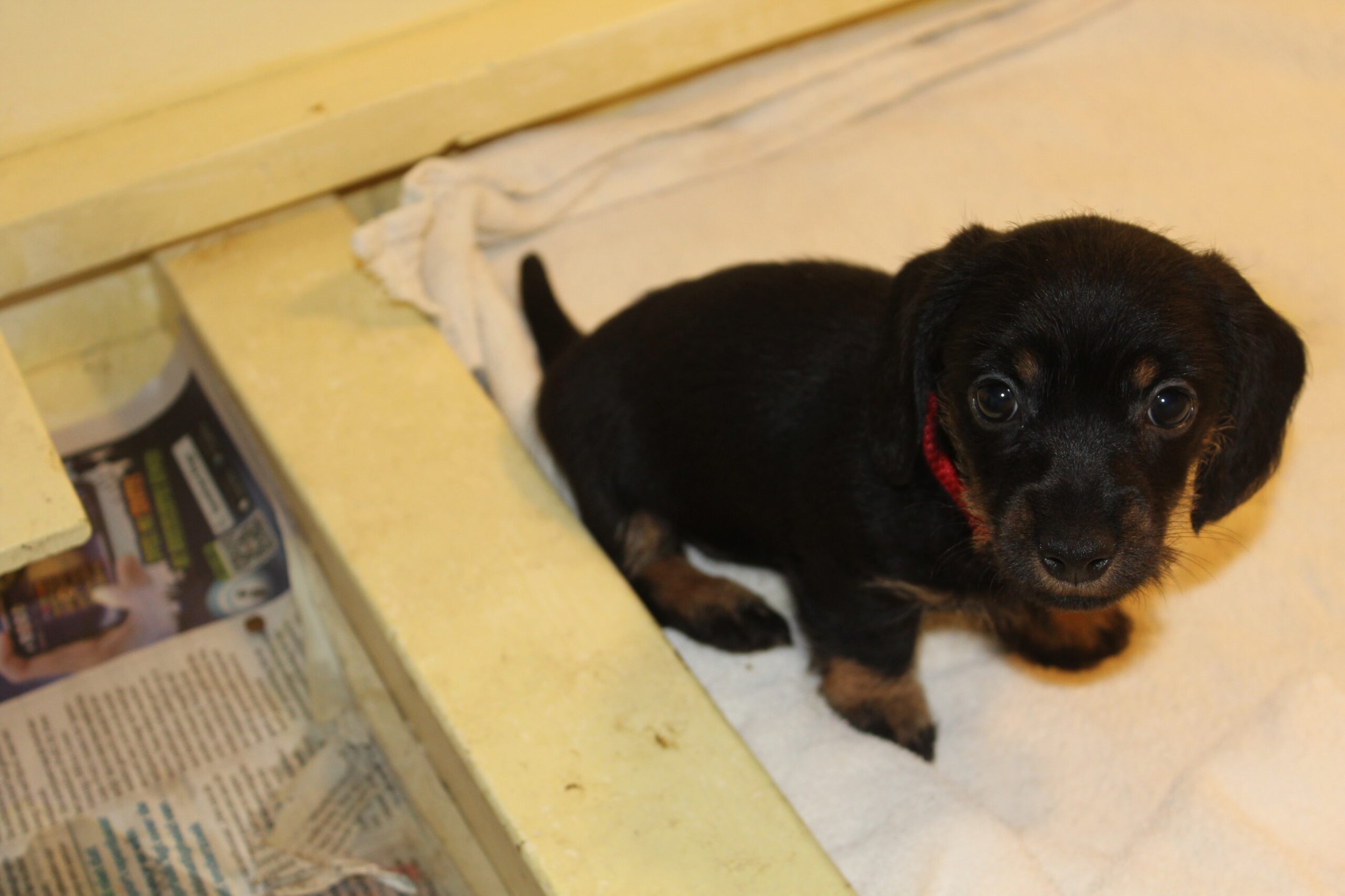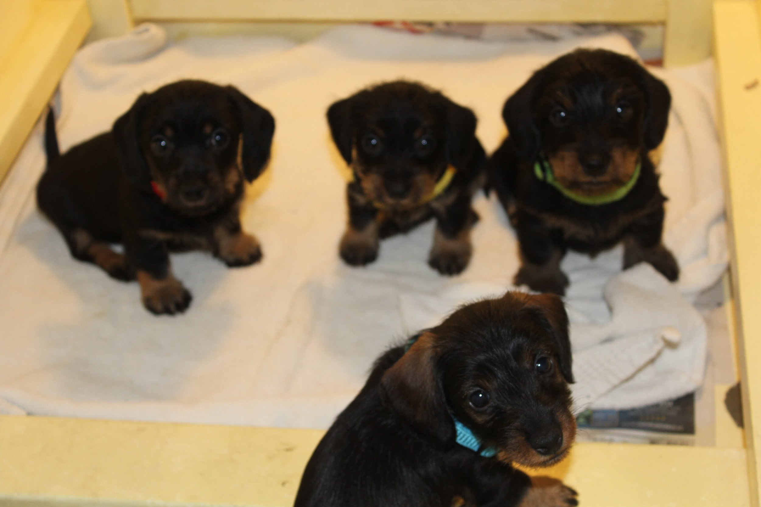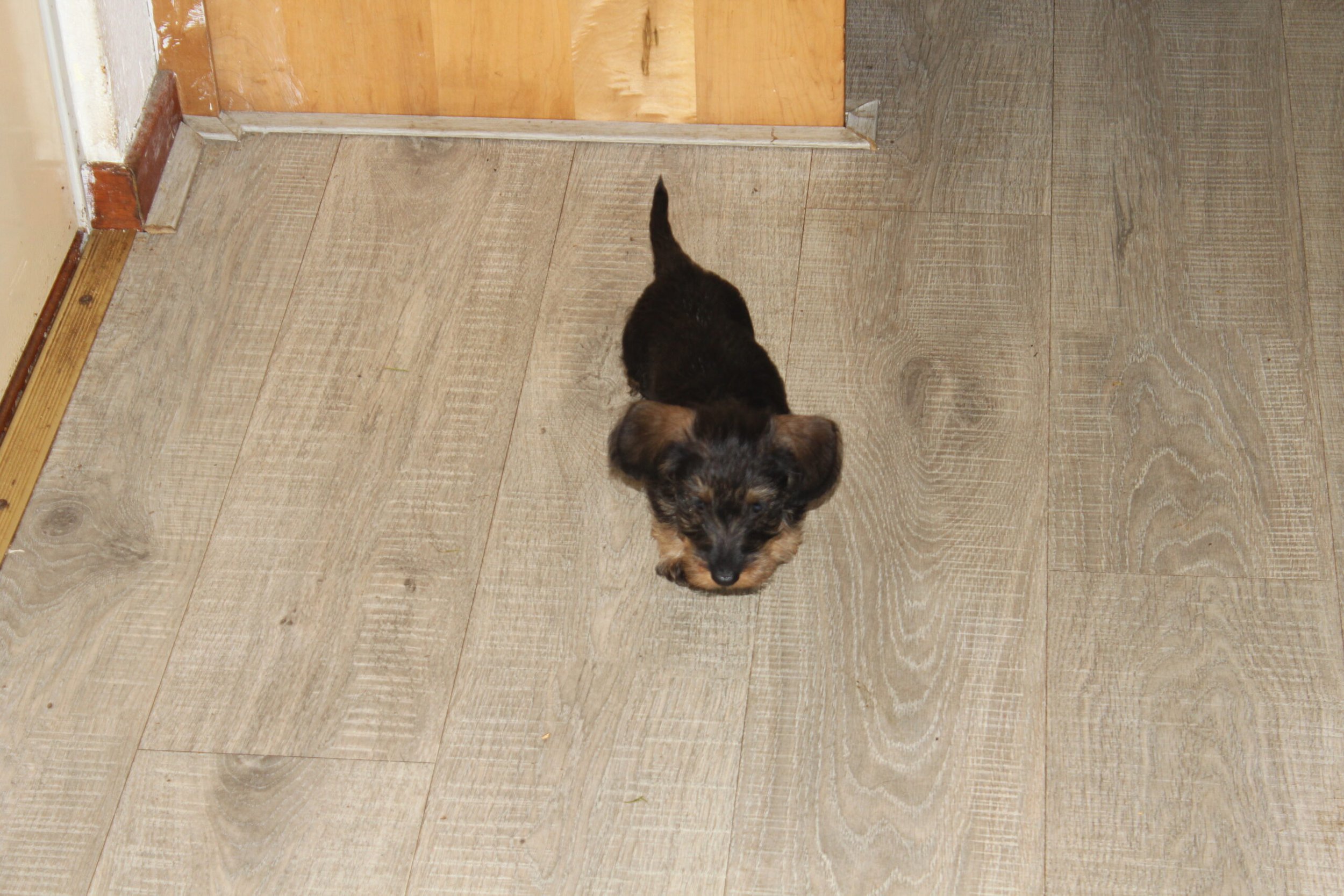 Nog een kleine week en Jacha zal ons gaan verlaten en zal haar gouden mandje krijgen bij al haar nieuwe baasjes. Zij hebben de afgelopen weken alles voorbereid voor de kleine meid. Jacha ontwikkelt zich goed en zit vreselijk graag op schoot om geknuffeld te worden. Al onze honden uit de roedel zijn maar druk met haar. Met name Juliette en Noëlle vinden haar maar wat interessant. Het kleine meisje is zo als een echte teckel betaamt; heerlijk nieuwsgierig en geniet van alle aandacht. Een echt prinsesje dus. We hopen dan ook, maar hebben daar alle vertrouwen in, dat ze samen met haar nieuwe baasjes langzamerhand de wijde wereld mag gaan ontdekken. Tot nu toe heeft ze het chippen, de DNA-afname en het bezoek aan de dierenarts niet als onplezierig ervaren. De dierenarts vond haar prachtig en goed gezond. Het is dan ook een levendig en prachtig meisje dat zeker een schare fans om zich heen zal gaan verzamelen. Allereerst zal het zeker wennen zijn om te slapen zonder mama, maar een lekkere warme kruik en een geurdoekje en wellicht een knuffel zal wonderen doen. Voor de baasjes is het dan ook knuffeltijd geblazen.