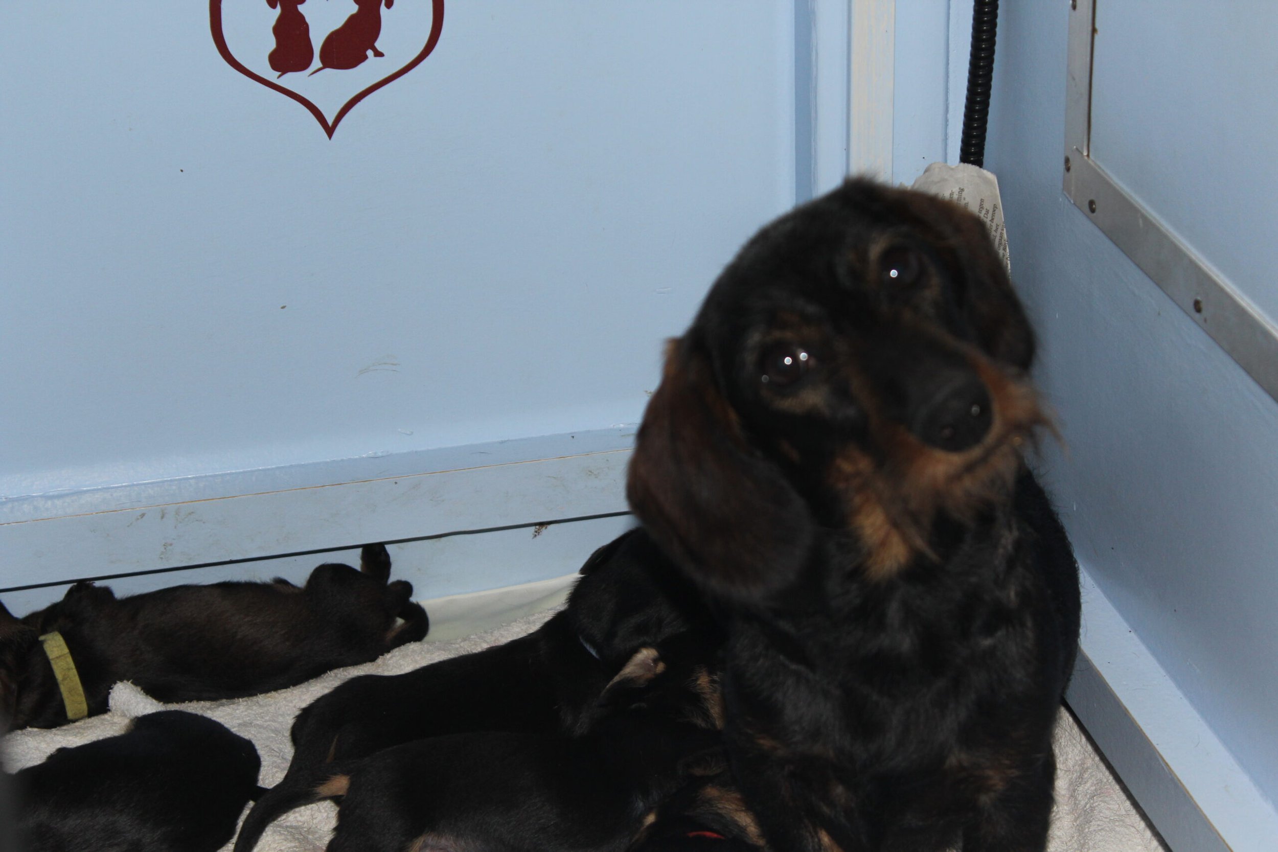 Wat doen ze het goed. Mama Angel is zo trots op haar kleintjes. Ze is ook erg proper. De kleintjes worden regelmatig keurig schoon gelikt. Daarna kijkt ze ons afwachtend aan en hoort graag onze complimentjes hoe goed ze het doet en dat ze zulke mooie pupjes heeft. Vrolijk kwispelend neemt ze onze complimentjes dan ook in ontvangst. Het is dan ook nog wel wat voor een jong teefje. Zo speel je nog lekker met alle teefjes - oud en jong – en zo ben je moeder van een vijftal wat je mag verzorgen. Gelukkig neemt ze haar taak heel serieus en dat merken we iedere avond tijdens de weegbeurt en een blik op de pups met hun glanzende vacht spreekt boekdelen. De rest van onze roedel speelt heerlijk rondom de werpkist en met name Julia wil zo nu en dan wel graag even in de werpkist kijken. Bert tilt haar dan even op en van een afstand kan ze dan even kijken. Julia is gek op pups. Te dichtbij wordt niet toegestaan. Onze jonge moeders laten dan duidelijk weten dat de afstand er voorlopig dient te zijn. Later mogen ze ook deelnemen aan een stukje van de opvoeding, maar nu nog niet. Nu zijn de pups nog lekker bij mama Angel.