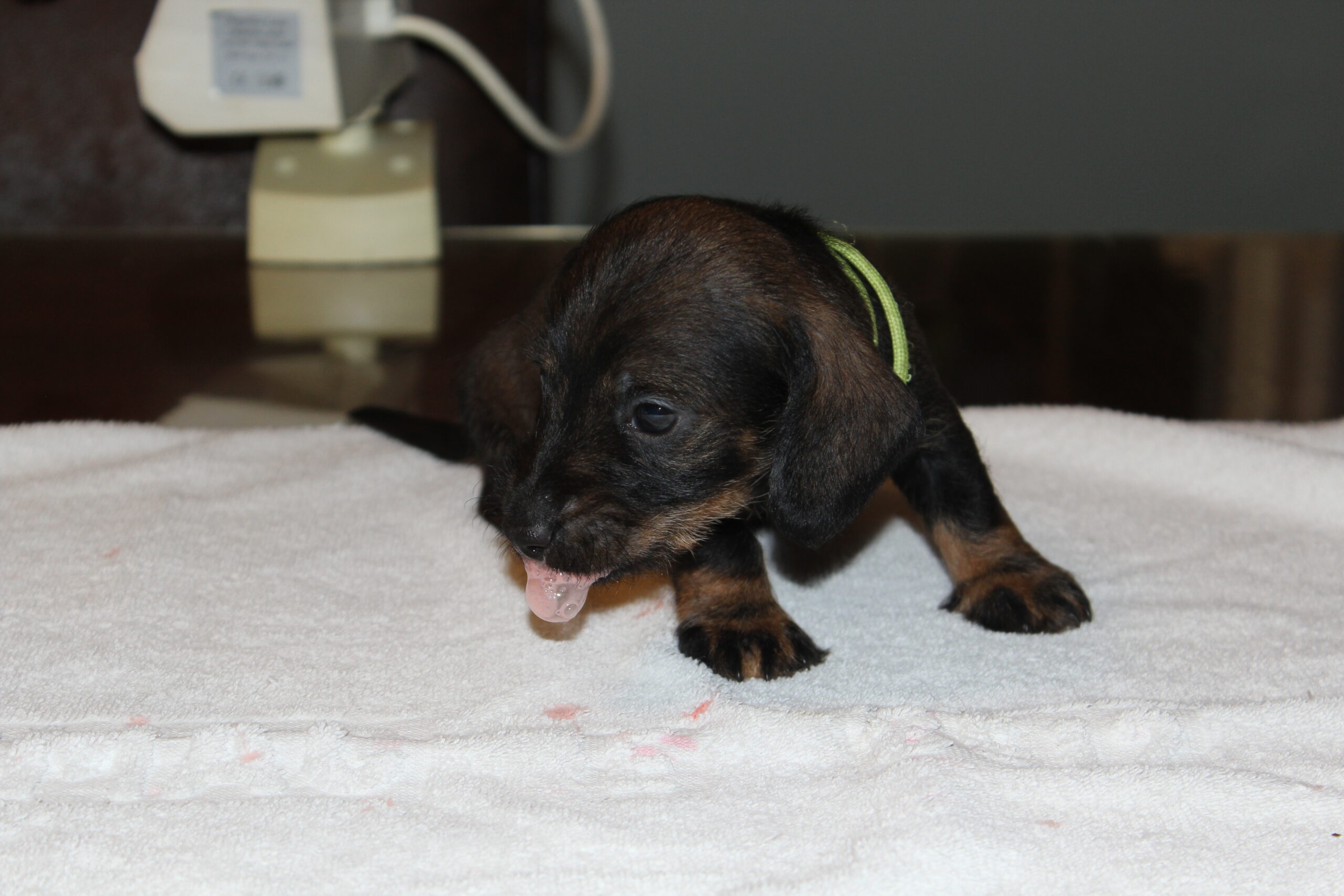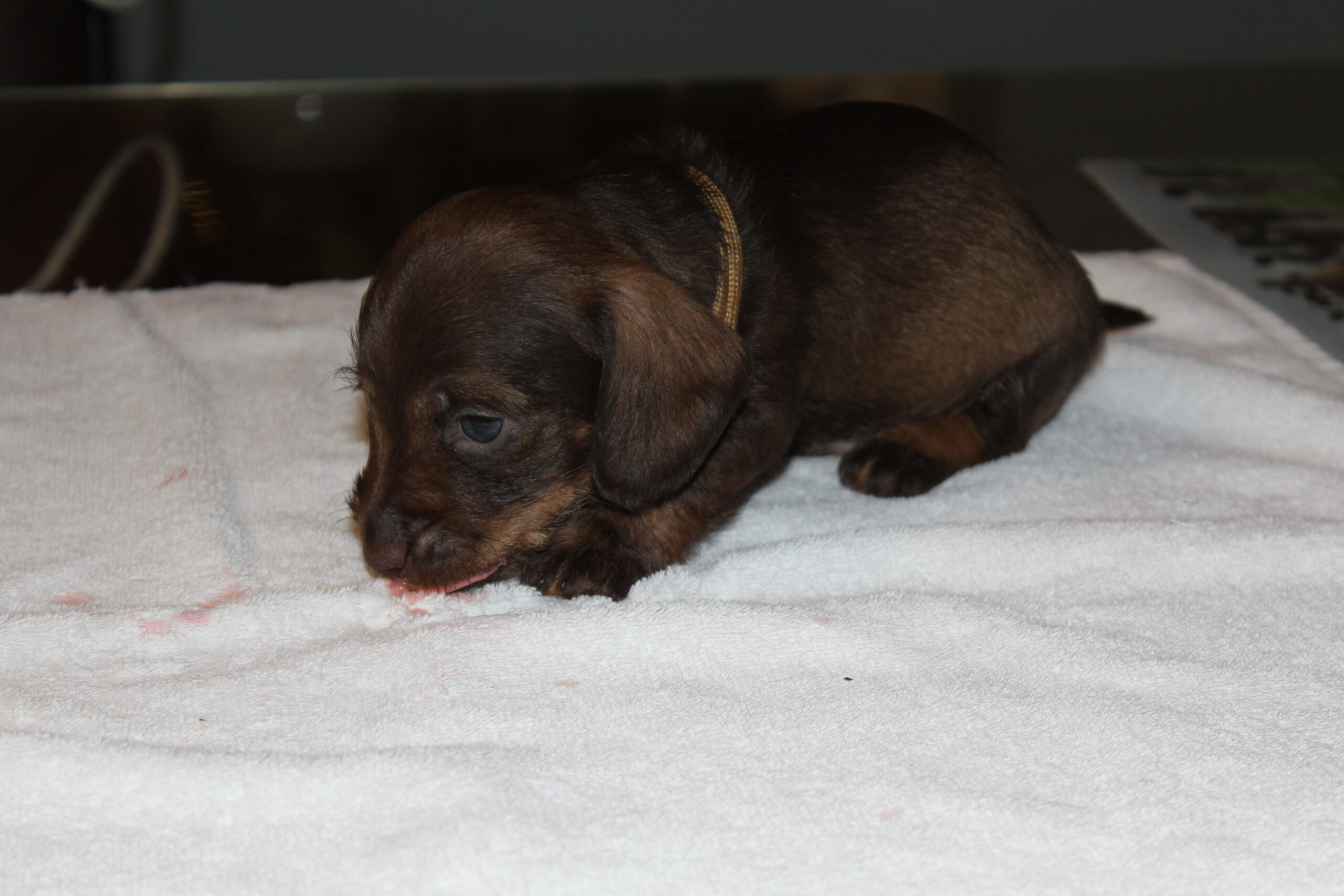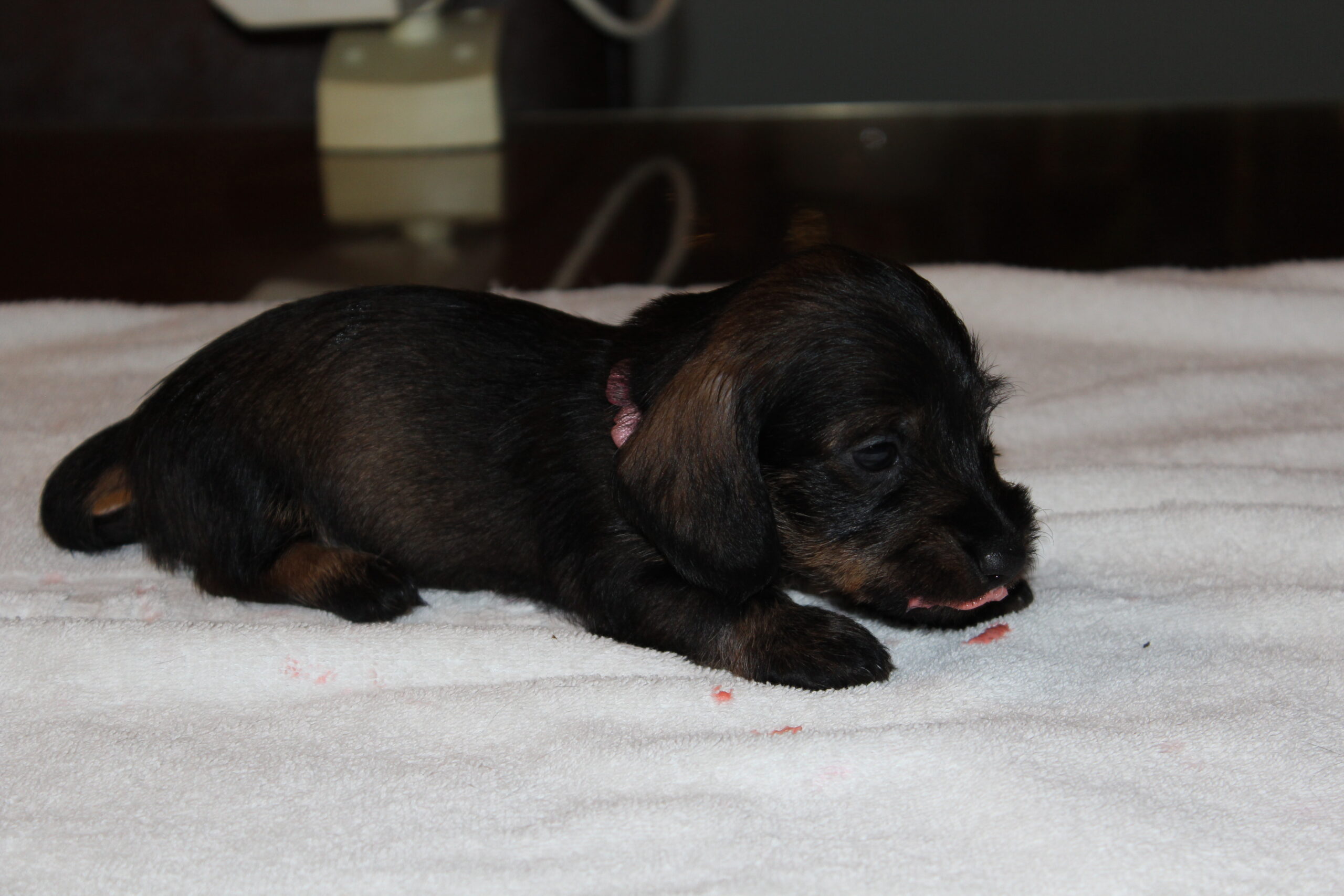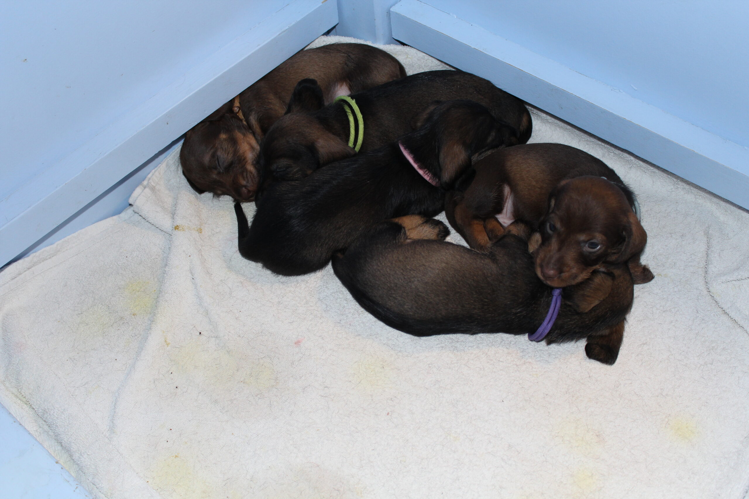 Wat groeien ze toch hard. Van kleine ‘molletjes’ naar mini-teckels. Inmiddels oefenen onze pupsels tussen het slapen en het eten door het lopen en dat gaat natuurlijk met vallen en opstaan. We zien de vooruitgang. Ook spelen ze graag met de oortjes van elkaar. Hier en daar is al een hoektandje doorgekomen en die moet je dan ook even testen. Het liefst op een broertje of zusje. Mama Fleur vindt het nogal heftig zo’n scherp tandje in haar tepels, maar doorstaat het moedig. Onvermoeibaar blijf ze haar kindjes voeden en liefdevol verzorgen en dat zien we terug bij de dagelijkse weegbeurt. Inmiddels zijn ook de eerste puppy -bezoekjes geweest. Zo gezellig altijd en wat is het fijn voor ons te zien hoe blij de nieuwe baasjes zijn met hun pup. Zo vloeit er soms ook een traantje, zowel bij het nieuwe baasje als wel bij mij (Herma). Hoe vaak zeggen we niet dat we daarom zijn gaan fokken. Mensen blij mogen maken met een gezonde en ook nog prachtige hond. We zijn bevoorrechte fokkers, die hopen dit nog een geruim aantal jaren te mogen doen. Intussen wachten nog meer nieuwe baasjes op hun pup, maar dat duurt dan nog even. Heb nog even geduld. Jullie pup zal ook komen. We begrijpen dat wachten soms lang duurt, maar jullie geduld wordt zeker beloond. Moeder Natuur kunnen we niet dwingen en we respecteren dat natuurlijk ook. Iemand is altijd welkom voor een bezoekje aan ons en de roedel. Dat kan het wachten wat verzachten, maar misschien ook wel bemoeilijken. Voor de echt ongeduldige geïnteresseerden hebben wij als alternatief een bevriende fokker van ons, die wellicht iets eerder een pup heeft. De keuze is aan u.