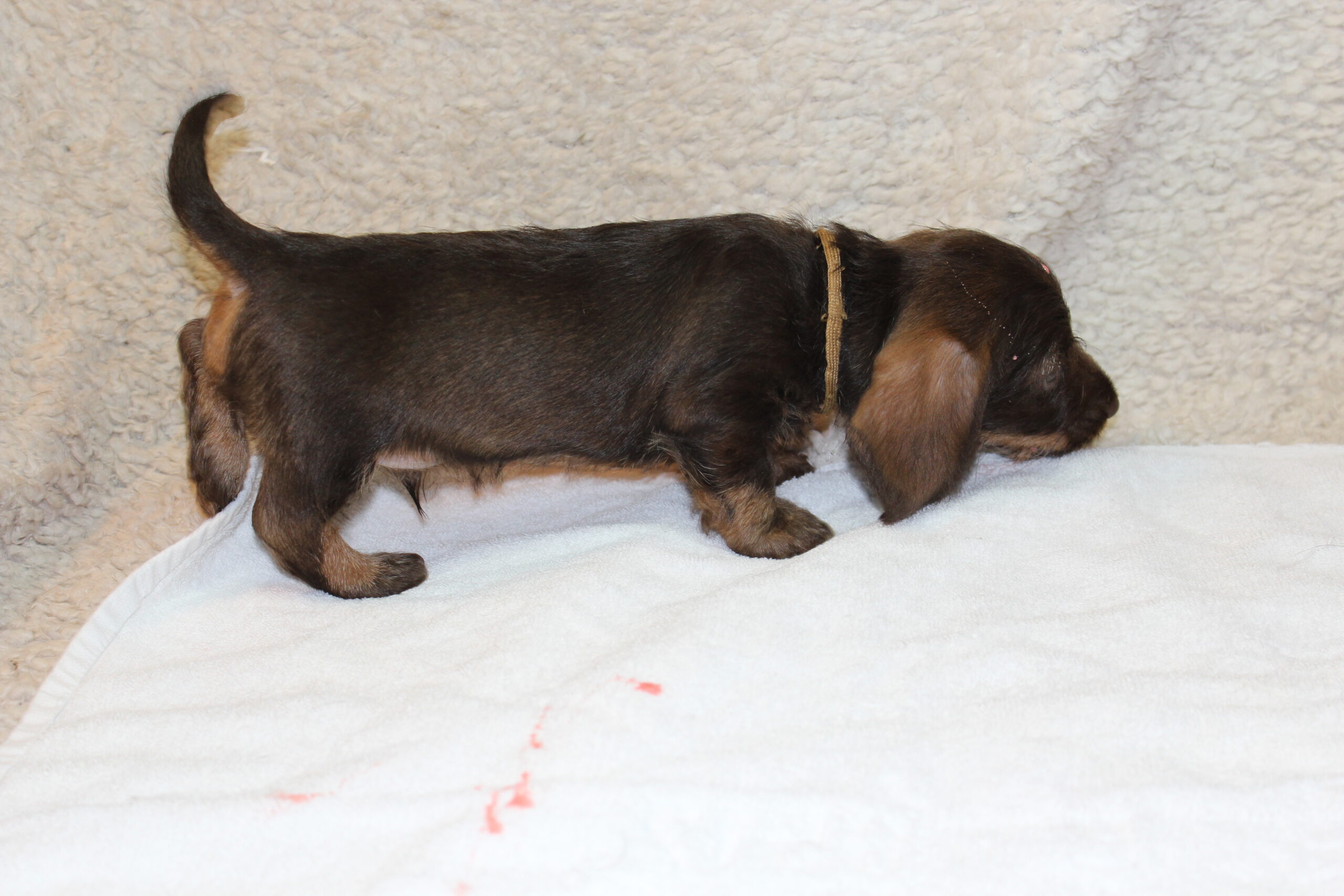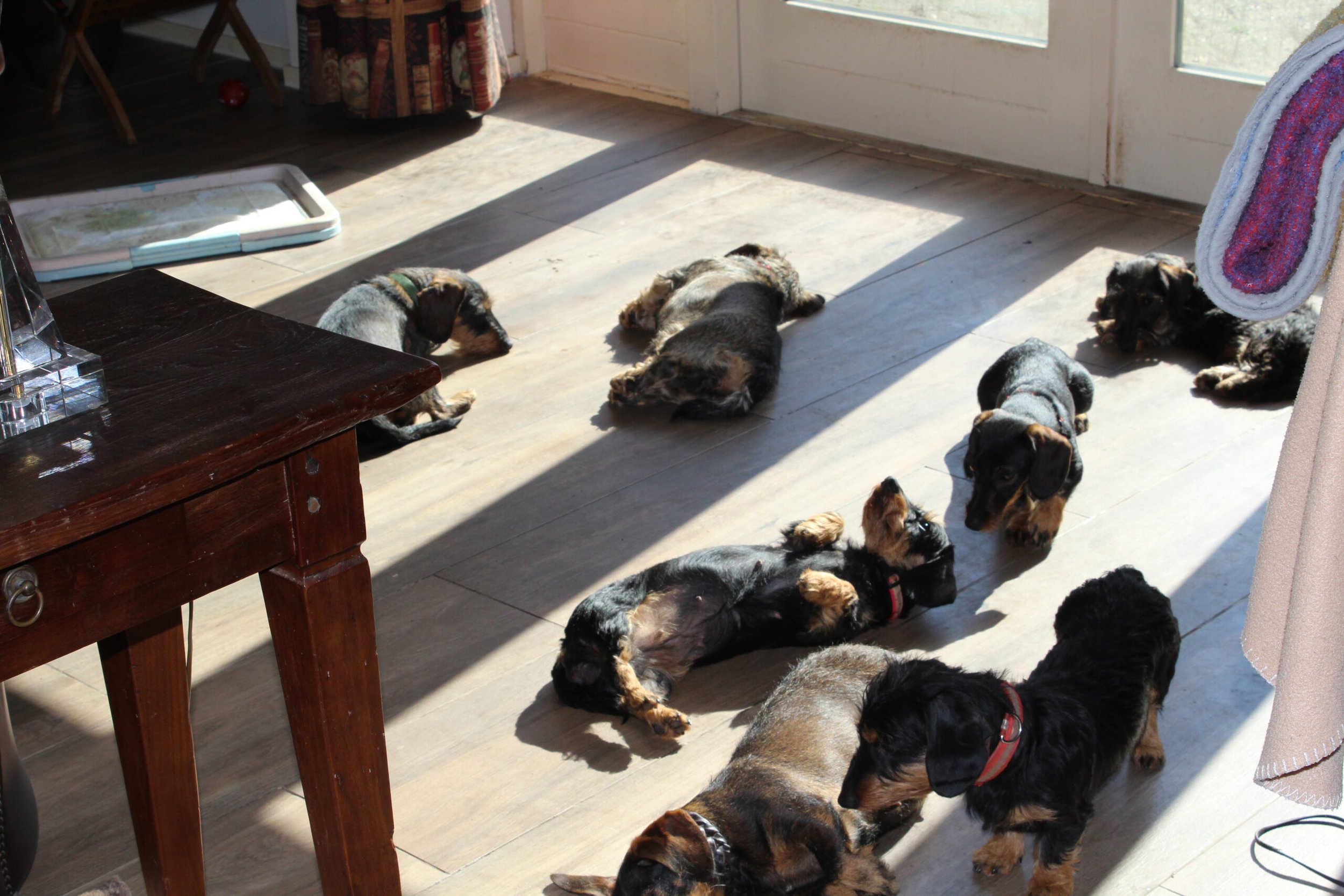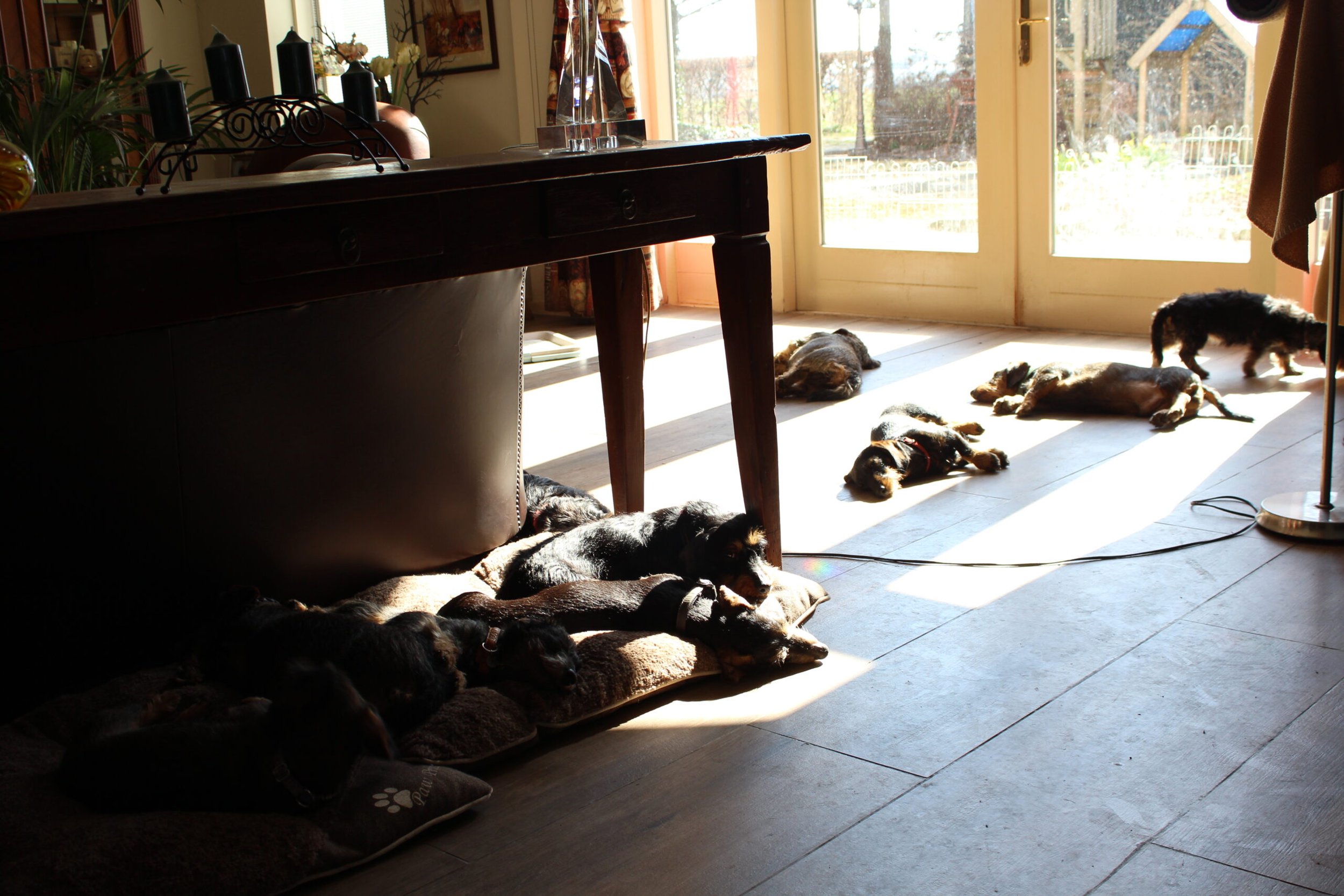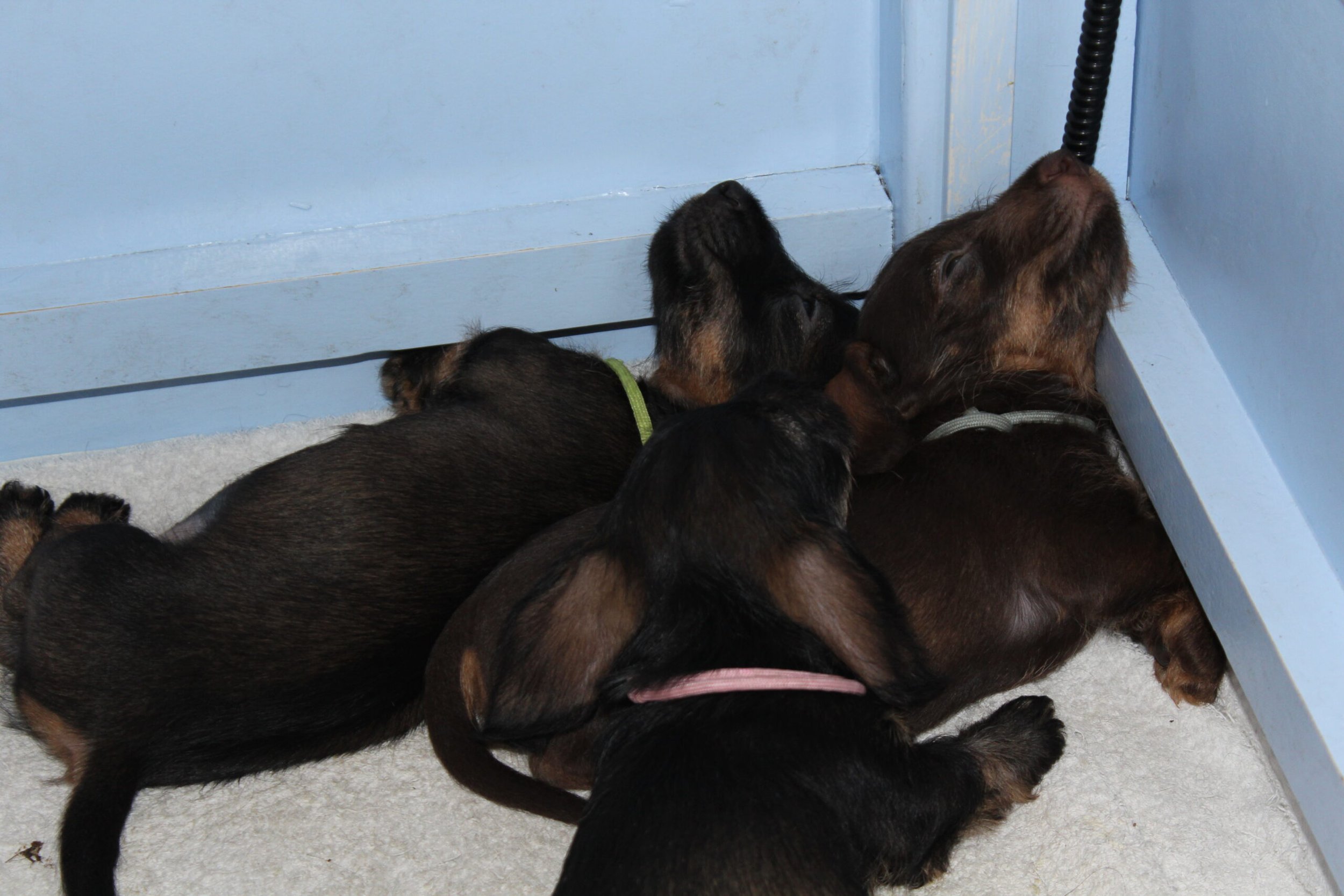 En het is langzamerhand een echte kleine boefjesbende aan het worden. ’s Morgens vroeg melden ze zich al om aan te geven dat het tijd is voor de Carnibest. Dit eten ze erg graag. De puppybrokjes ook wel, maar het vlees is echt favoriet. Mama Fleur is ietwat meer ‘uithuizig’ nu de kleintjes zich zo goed ontwikkelen. Zeker geeft ze hen nog wel melk, maar iedereen kan zich voorstellen dat de nieuw doorgekomen tandjes het voor mama niet prettiger maken. Fleur laat zich als een goed mamaatje betaamt echter niet kennen en voedt ze toch nog steeds tussendoor. Dat het helpt is niet alleen op de weegschaal te zien, maar ook aan de grootte van de kleintjes. Wat groeien ze goed! En nog maar niet te spreken van de verdere ontwikkelingen. We weten onderhand allemaal wel dat teckels best pienter zijn. Om aan deze verwachting te voldoen, lezen ze trouw de krant, die in de werpkist ligt en daarna wordt deze met de nieuwe tandjes aan stukjes verscheurd. Op het overgebleven gedeelte doen ze netjes hun behoefte. Natuurlijk gaat dat wel eens mis, maar mama corrigeert ze daarop wel. Ja, de lange weg naar het opgroeien, zetten ze dapper in. Naast het eten en slapen, spelen ze ook al veel met elkaar. Het knuffelen met Bert is ook altijd een standaard niet te versmaden onderdeel gedurende de dag.