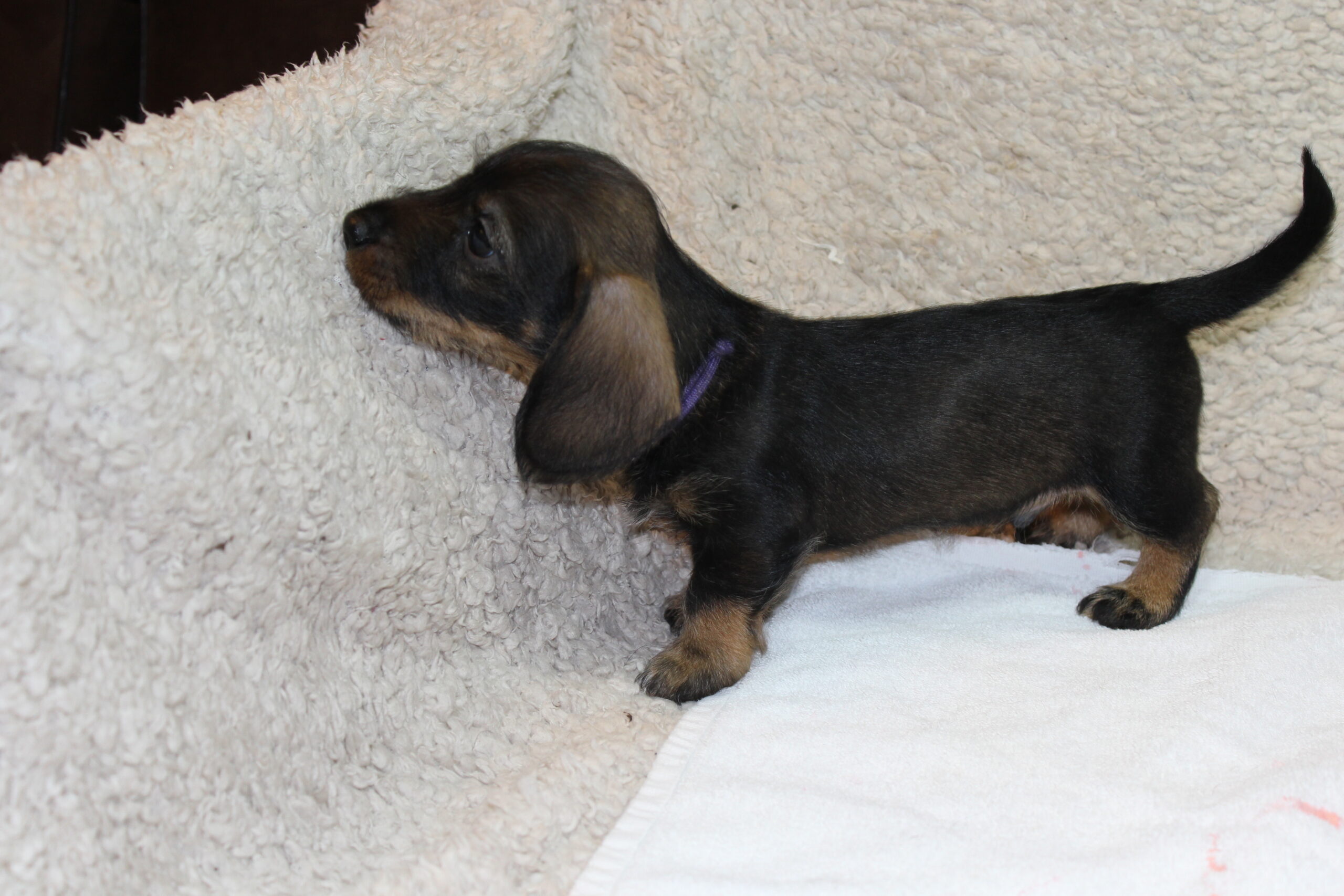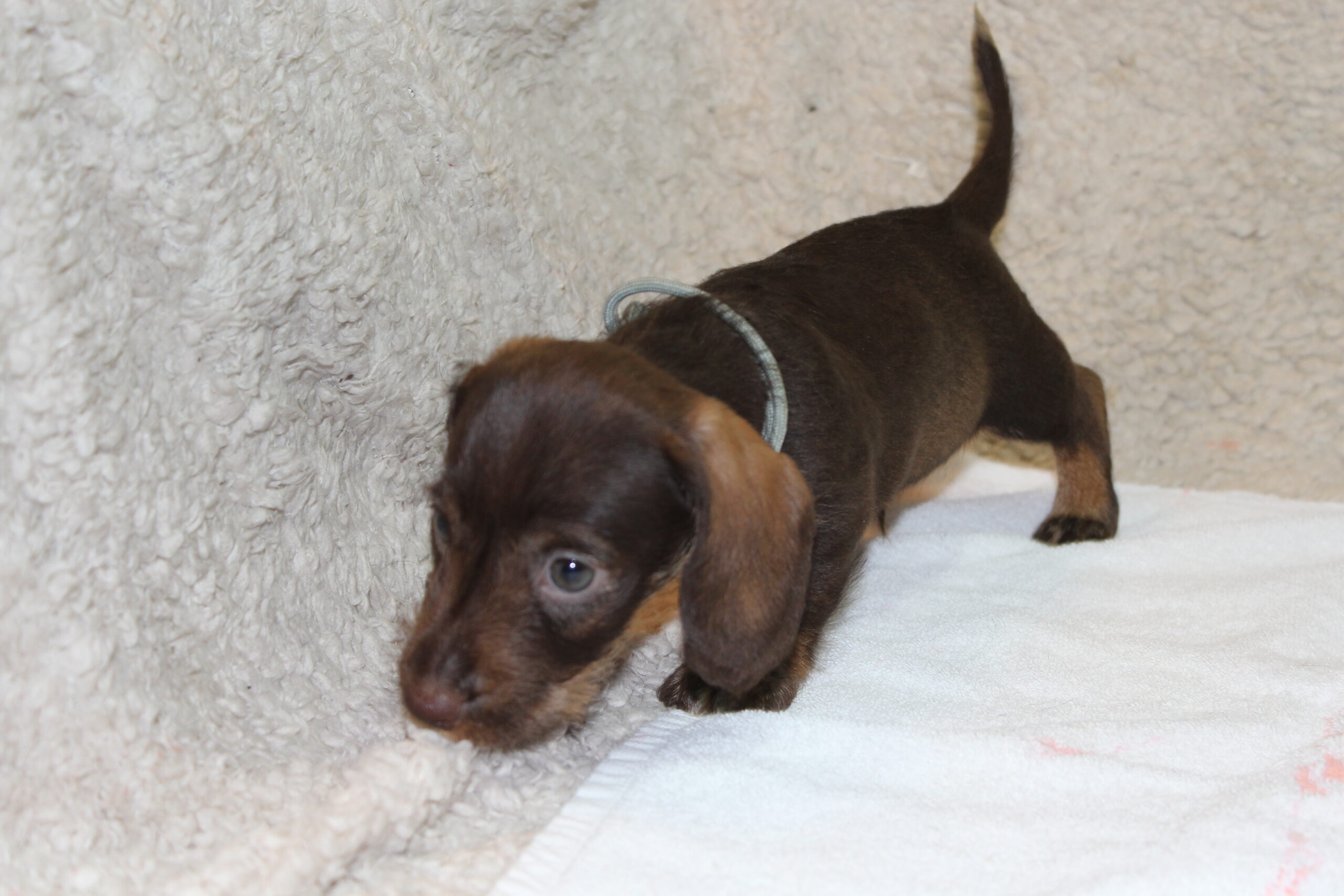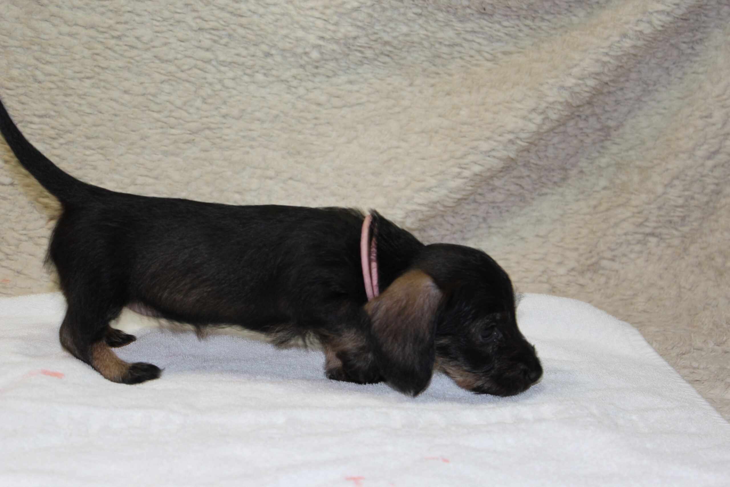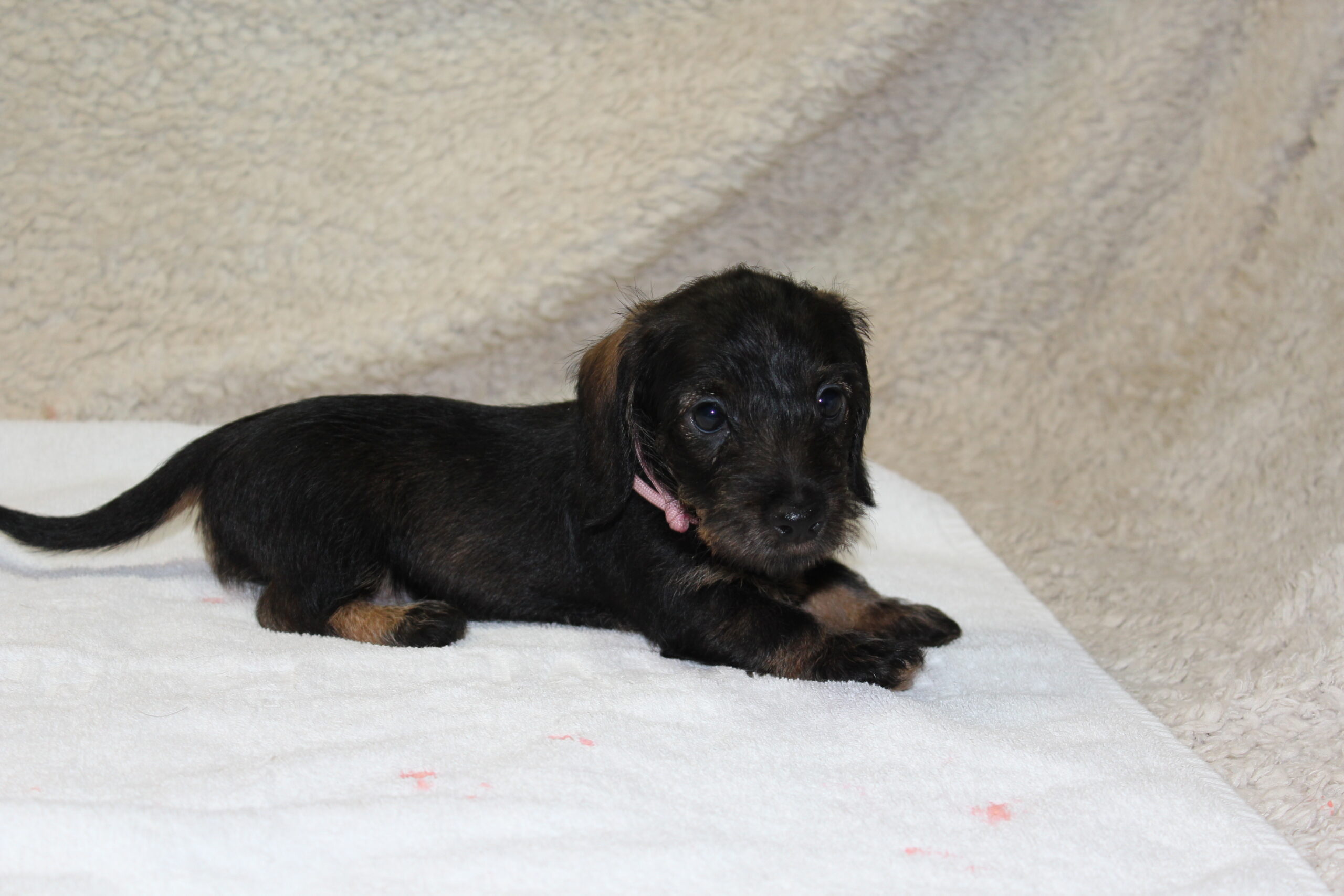 En het is langzamerhand een echte kleine boefjesbende aan het worden. ’s Morgens vroeg melden ze zich al om aan te geven dat het tijd is voor de Carnibest. Dit eten ze erg graag. De puppybrokjes ook wel, maar het vlees is echt favoriet. Mama Fleur is ietwat meer ‘uithuizig’ nu de kleintjes zich zo goed ontwikkelen. Zeker geeft ze hen nog wel melk, maar iedereen kan zich voorstellen dat de nieuw doorgekomen tandjes het voor mama niet prettiger maken. Fleur laat zich als een goed mamaatje betaamt echter niet kennen en voedt ze toch nog steeds tussendoor. Dat het helpt is niet alleen op de weegschaal te zien, maar ook aan de grootte van de kleintjes. Wat groeien ze goed! En nog maar niet te spreken van de verdere ontwikkelingen. We weten onderhand allemaal wel dat teckels best pienter zijn. Om aan deze verwachting te voldoen, lezen ze trouw de krant, die in de werpkist ligt en daarna wordt deze met de nieuwe tandjes aan stukjes verscheurd. Op het overgebleven gedeelte doen ze netjes hun behoefte. Natuurlijk gaat dat wel eens mis, maar mama corrigeert ze daarop wel. Ja, de lange weg naar het opgroeien, zetten ze dapper in. Naast het eten en slapen, spelen ze ook al veel met elkaar. Het knuffelen met Bert is ook altijd een standaard niet te versmaden onderdeel gedurende de dag.