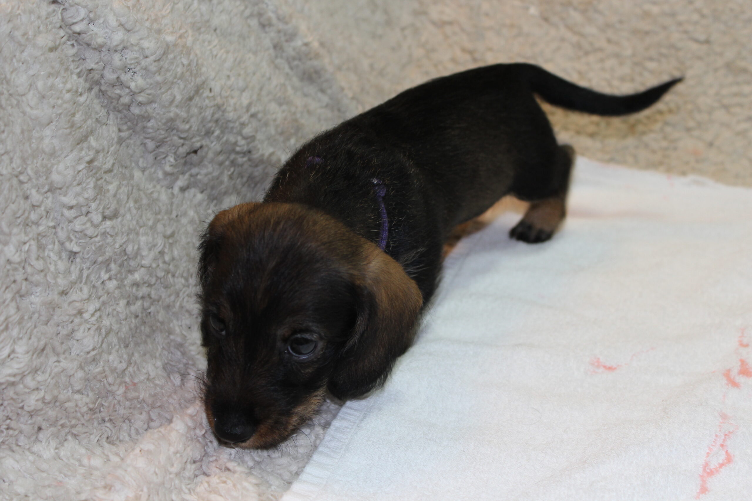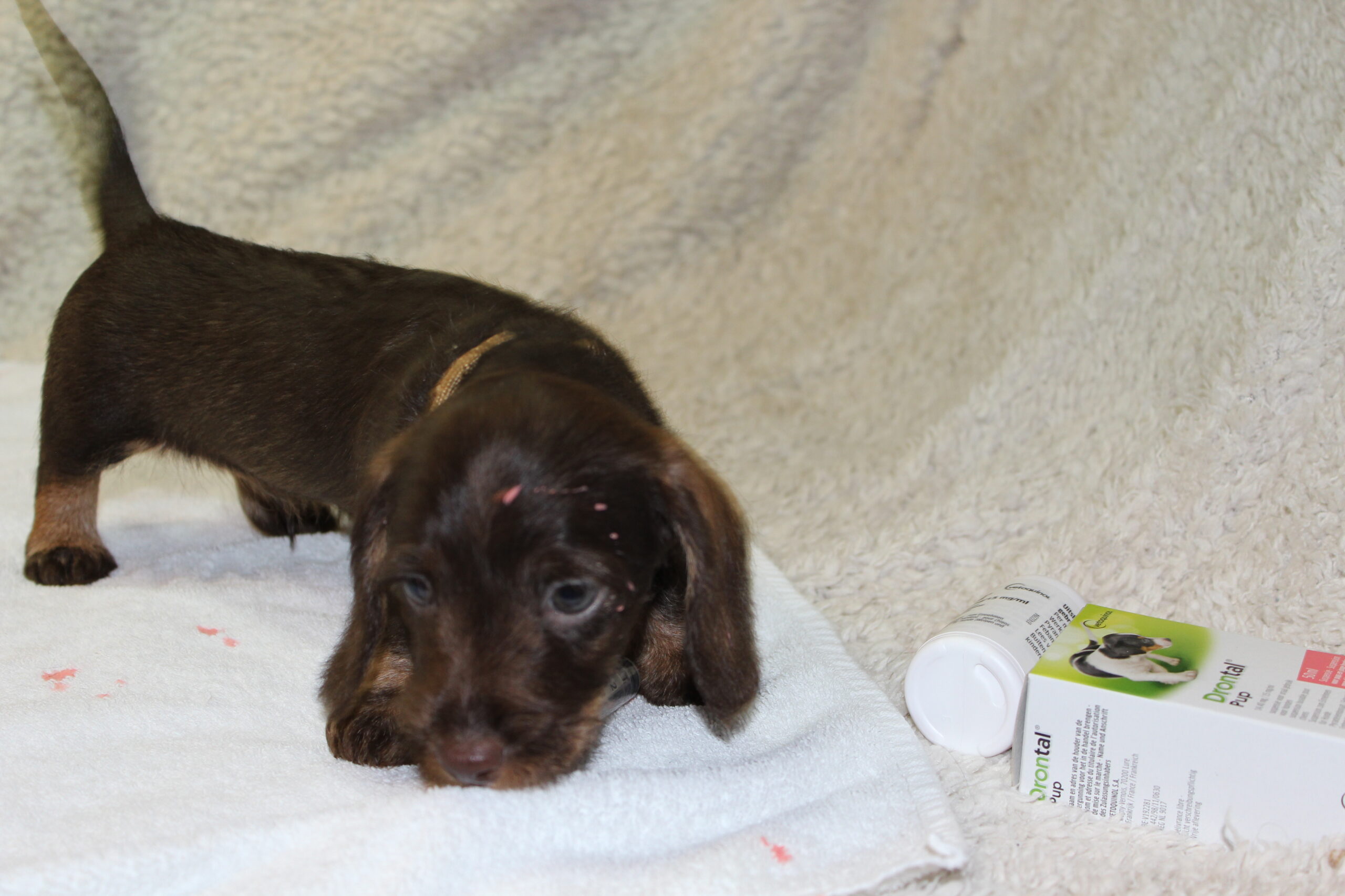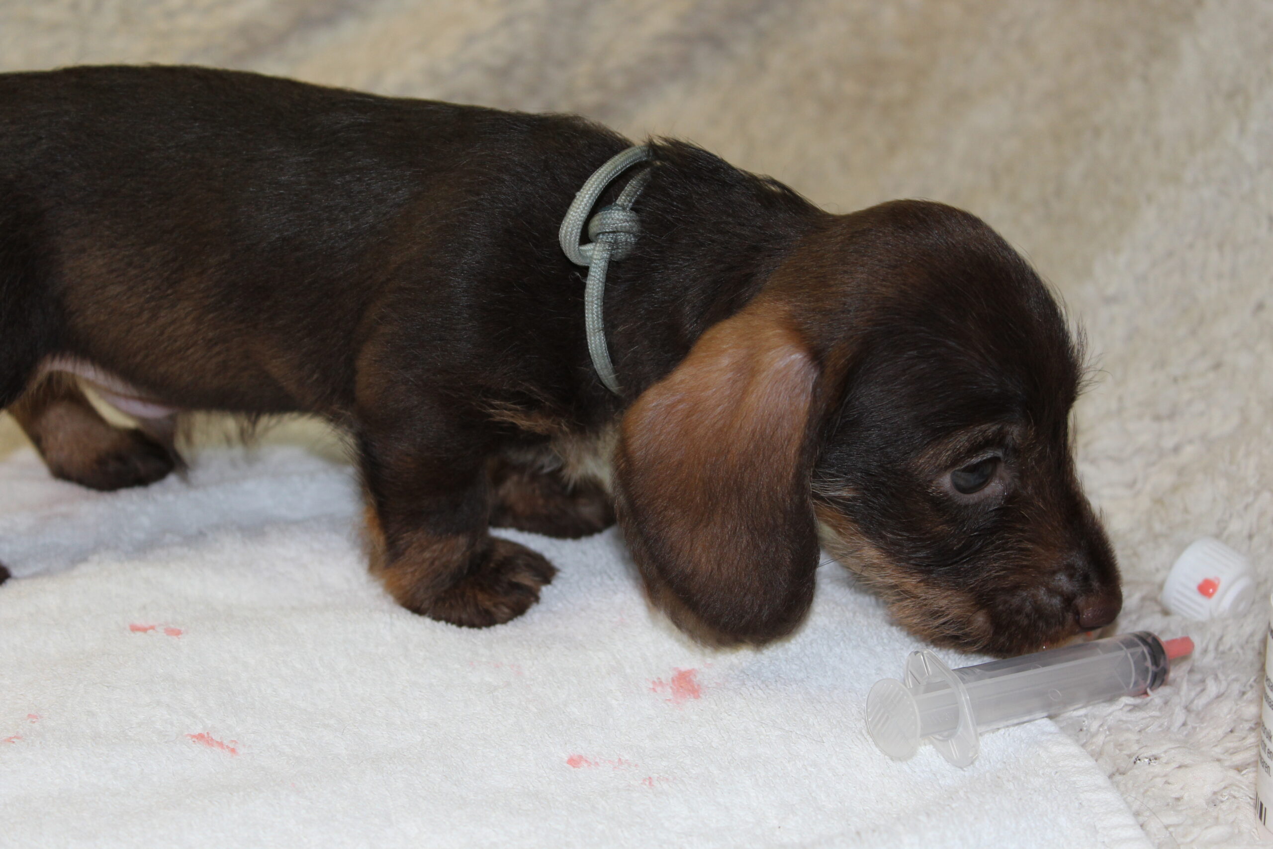 Dit was deze week een heerlijke dagelijkse bezigheid voor de rakkertjes, maar vorige week doemde er weer een mevrouw op van de Raad van Beheer. Ze bracht eerst allemaal dingen in gereedheid en toen mochten de pups een voor een het ritueel ondergaan. Allereerst de chip, die met een speciale holle naald werd ingebracht. Wat een bikkels waren ze. Geen kik werd er gegeven en de nieuwsgierigheid overwon het van eventuele angst. Ze werden dan ook goed door Bert begeleid en de dame van de Raad van Beheer is erg lief en kundig. De lieve kopjes gingen alle kanten op om maar niets te missen. De kleintjes zijn zo heerlijk alert en dat is echt genieten. Daarna wordt er met een flinke wattenstaaf het benodigde DNA afgenomen. Aansluitend wordt gecontroleerd of de chip functioneert en als dit het geval blijkt te zijn, worden alle gegevens meteen in de computer ingevoerd. Voor Bert volgde deze week ook nog een bezoek aan de dierenarts. Ook hier overwon de nieuwsgierigheid het weer van eventuele angst. De dierenarts beluisterde en onderzocht en woog de pups met grote zorgvuldigheid en was meer dan tevreden. Bert kreeg weer een heel groot compliment voor het prachtige en gezonde stel pups, waarbij geen gebrek werd waargenomen. De dierenarts vindt het geweldig om zo’n fokker in zijn klantenbestand te hebben. Bert groeide wederom van trots en dat mag toch ook. Of niet dan? Ik zie zijn dagelijkse toewijding en liefde voor het ras en dat vertaalt zich zeker in de gezonde en karaktervolle pups. Ik mag ze na deze eerste inenting nu ook lekker knuffelen en dat alles resulteert in gezonde en heerlijke knuffelkonten. Wat boffen we toch dat we dit mogen doen. Ja, het teckelvirus raken we niet meer kwijt.