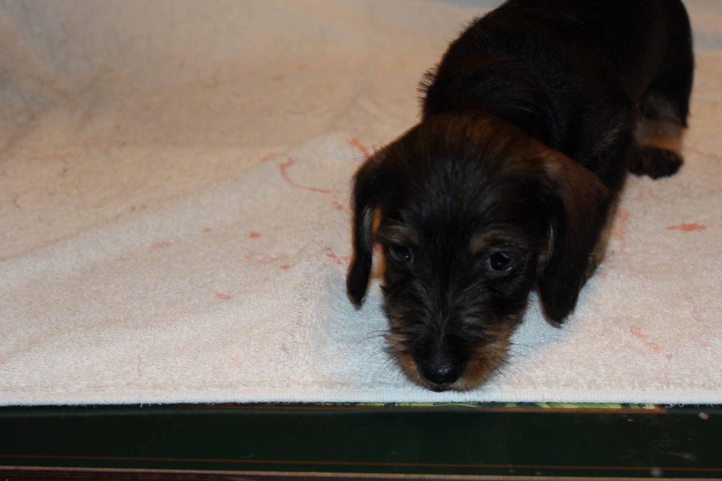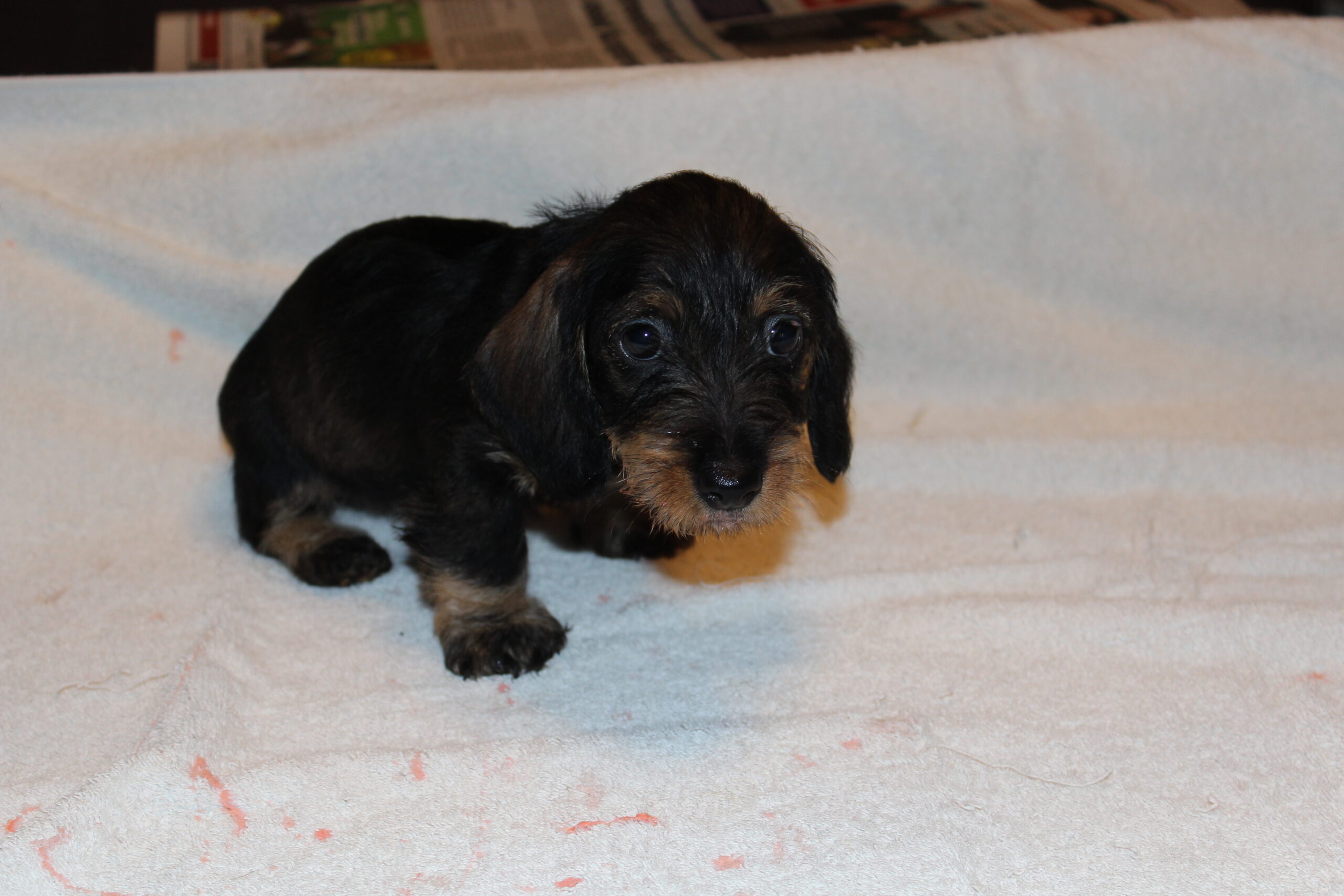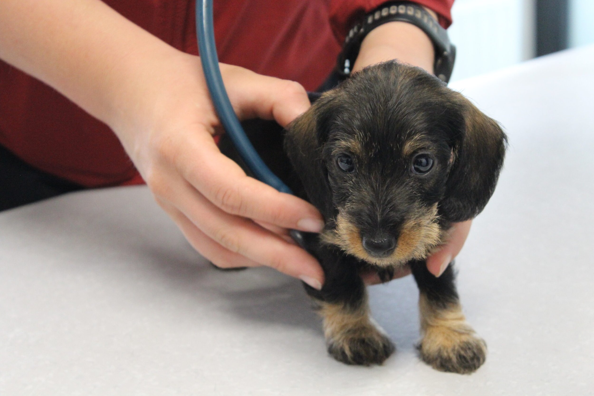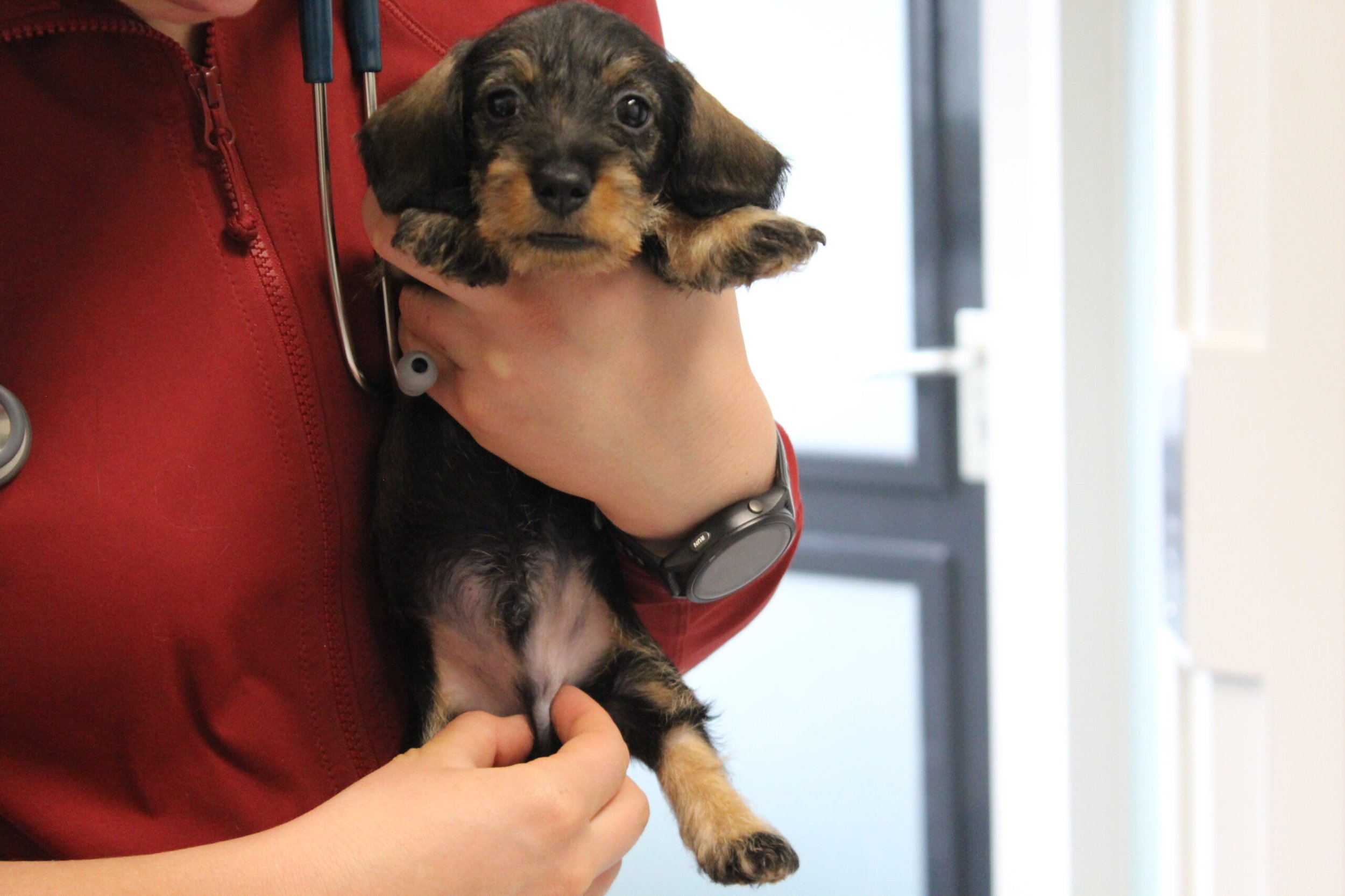 Een week na het bezoek van de chipster voor het chippen en de DNA afname stond nu het bezoek aan de dierenarts op de agenda. Met elkaar in de reisbench op weg voor een eerste bezoek aan de dierenarts. Veel nieuwe indrukken en de kleine rakkertjes keken hun ogen dan ook uit. Het enthousiaste welkom van de assistentes blijft geweldig. Echte teckelgekken, die dit fraais niet kunnen weerstaan. Vervolgens een eerste ontmoeting met een dierenarts. Er werd geklopt, gevoeld en geluisterd. Wat een poppenkast dachten de kleintjes waarschijnlijk, maar voor ons is het toch altijd weer spannend. De dierenarts was wederom zeer tevreden hoe ze er uitzagen en hoe alles het naar behoren deed. Bij de heren waren inmiddels bij alle drie hun balletjes ingedaald. Het was voor de kleintjes een avontuur en je wordt er ook moe van. Op een foto zie je de oogjes van een pup al wat kleiner worden. Ze vonden het mooi geweest en wilden graag weer naar het warme nestje om lekker tegen elkaar aan in slaap te vallen. Ook van de eerste inenting kunnen ze soms iets last hebben dus dan is een heerlijk slaapje altijd welkom. Normaliter hadden ze nu ook hun derde wormenkuur gehad, maar die kregen ze afgelopen zaterdag, omdat alles tegelijkertijd misschien problemen zou kunnen geven. Veiligheid voor alles is ons motto.