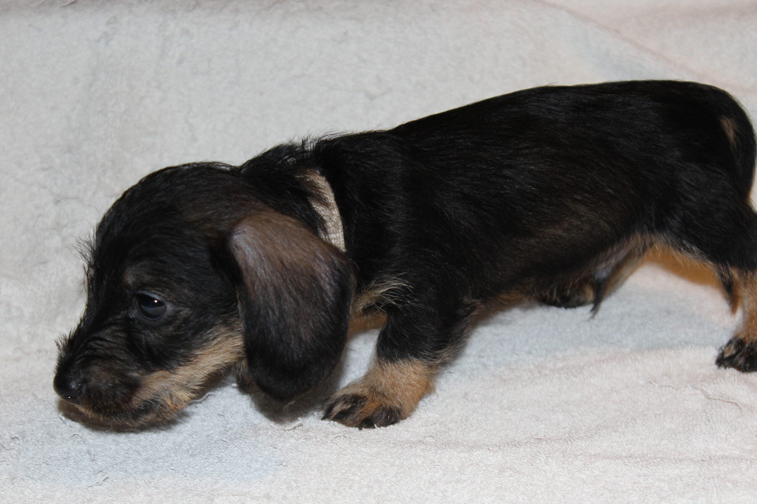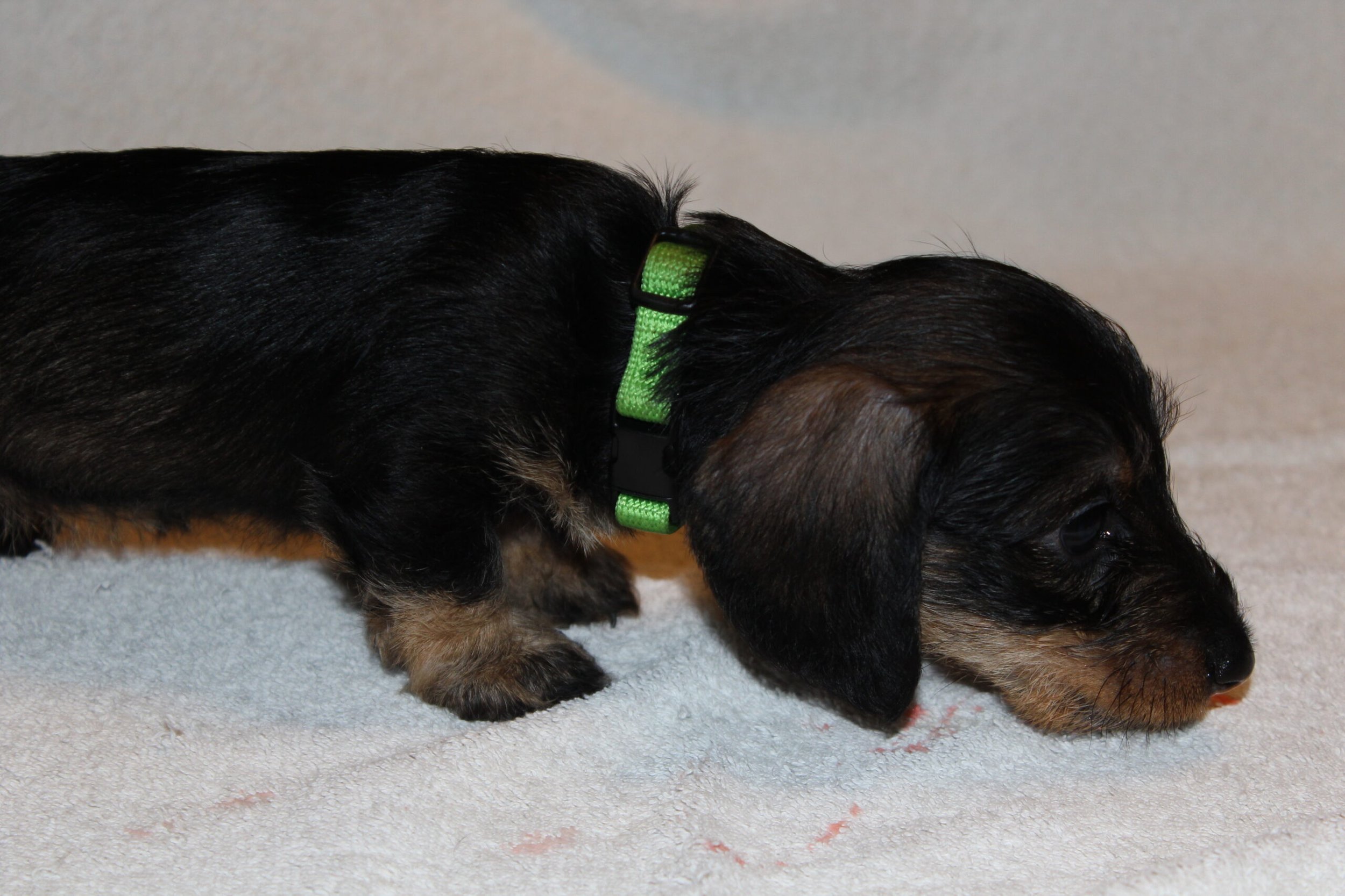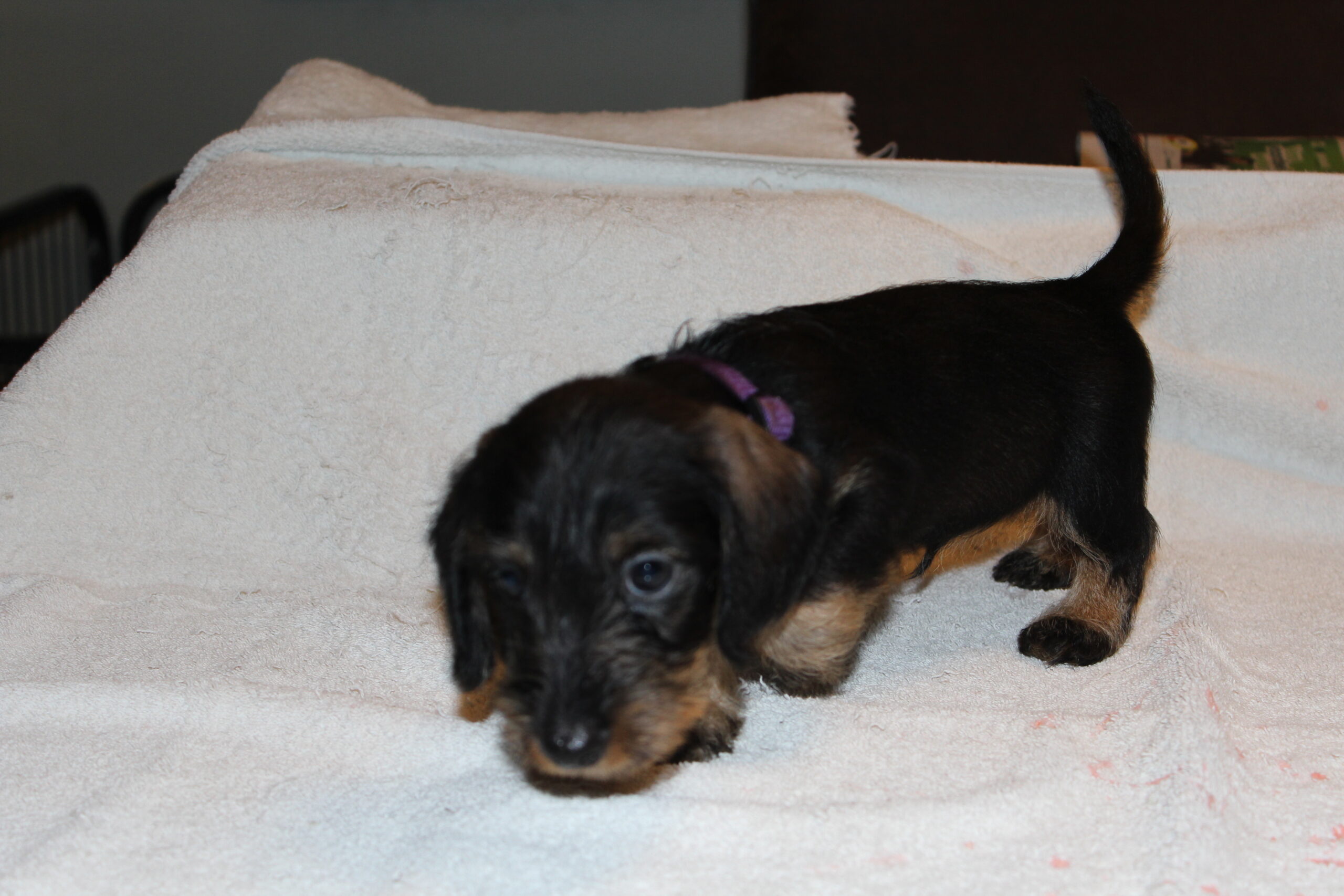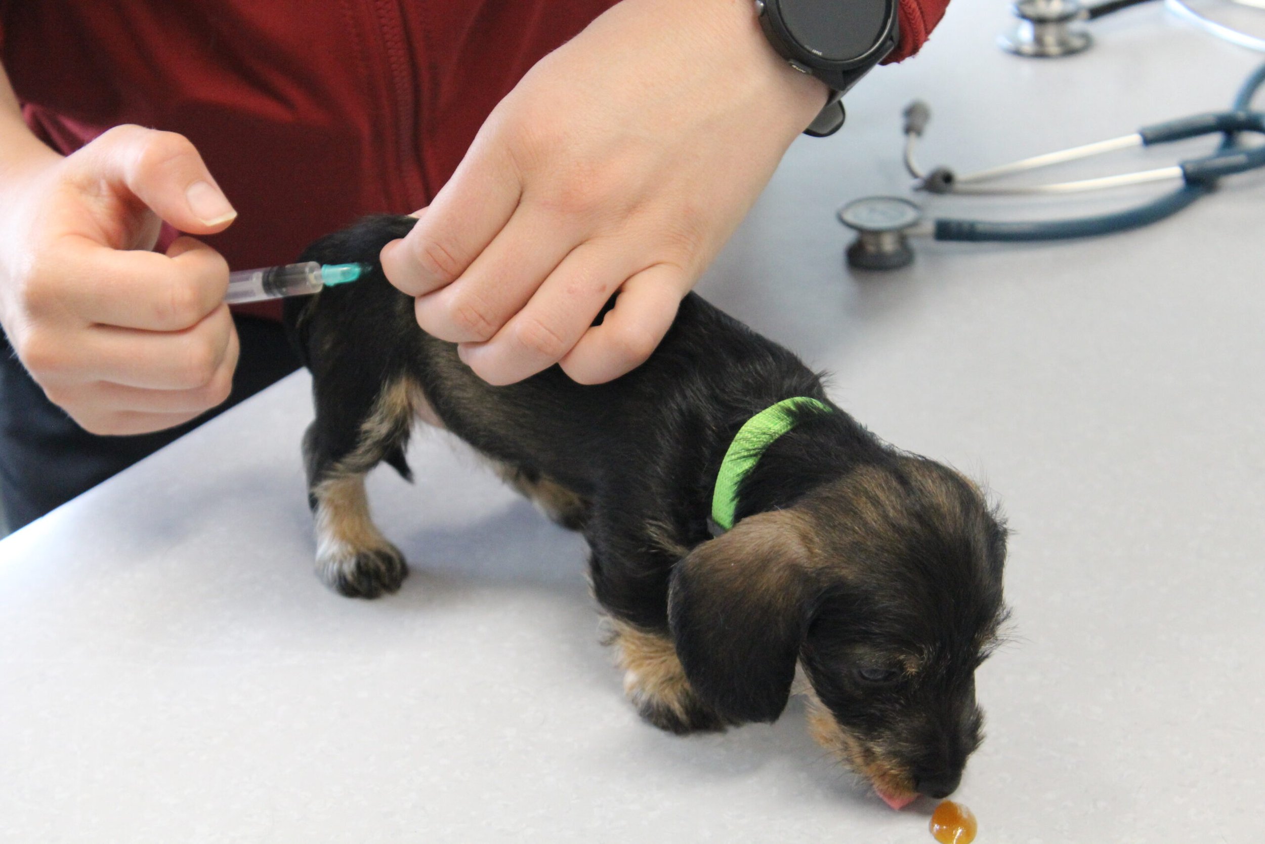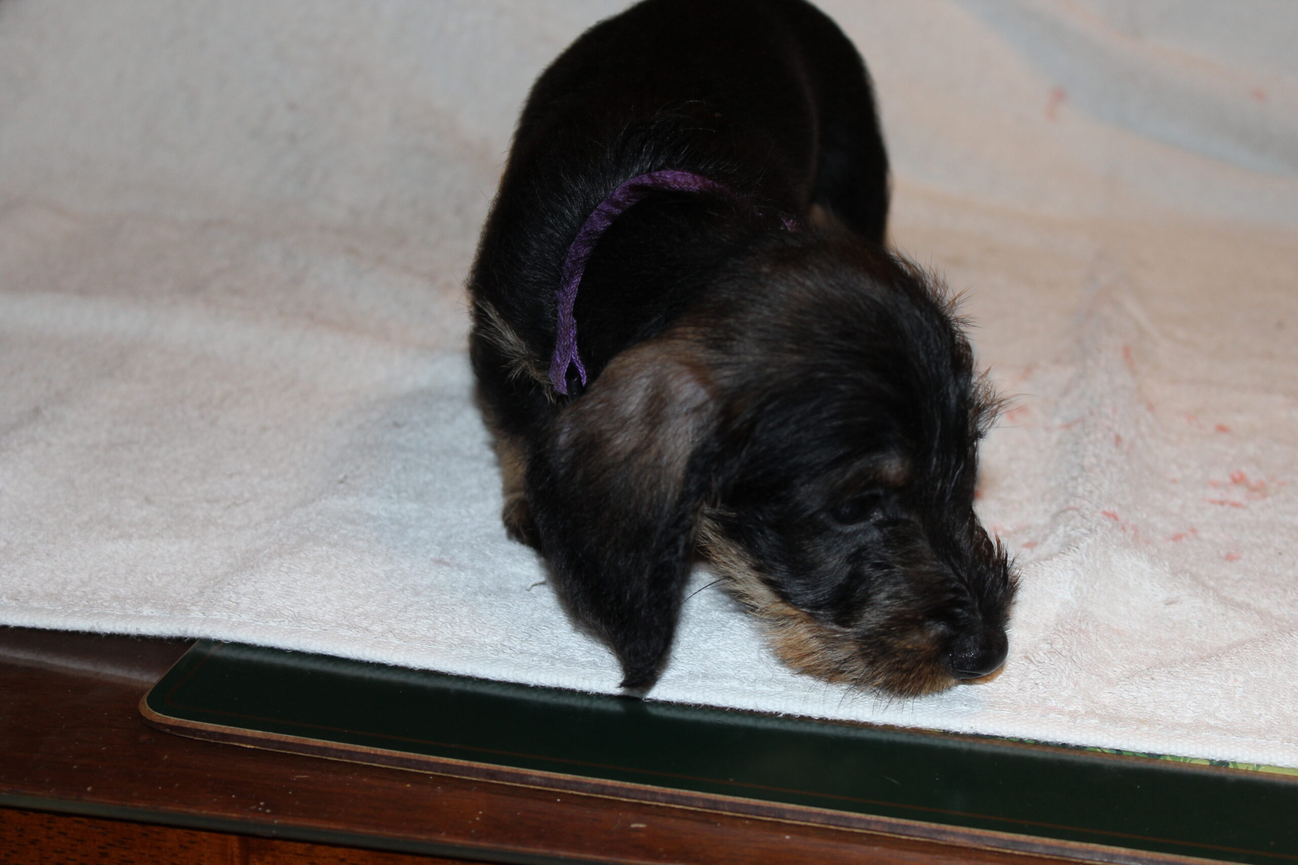 Een week na het bezoek van de chipster voor het chippen en de DNA afname stond nu het bezoek aan de dierenarts op de agenda. Met elkaar in de reisbench op weg voor een eerste bezoek aan de dierenarts. Veel nieuwe indrukken en de kleine rakkertjes keken hun ogen dan ook uit. Het enthousiaste welkom van de assistentes blijft geweldig. Echte teckelgekken, die dit fraais niet kunnen weerstaan. Vervolgens een eerste ontmoeting met een dierenarts. Er werd geklopt, gevoeld en geluisterd. Wat een poppenkast dachten de kleintjes waarschijnlijk, maar voor ons is het toch altijd weer spannend. De dierenarts was wederom zeer tevreden hoe ze er uitzagen en hoe alles het naar behoren deed. Bij de heren waren inmiddels bij alle drie hun balletjes ingedaald. Het was voor de kleintjes een avontuur en je wordt er ook moe van. Op een foto zie je de oogjes van een pup al wat kleiner worden. Ze vonden het mooi geweest en wilden graag weer naar het warme nestje om lekker tegen elkaar aan in slaap te vallen. Ook van de eerste inenting kunnen ze soms iets last hebben dus dan is een heerlijk slaapje altijd welkom. Normaliter hadden ze nu ook hun derde wormenkuur gehad, maar die kregen ze afgelopen zaterdag, omdat alles tegelijkertijd misschien problemen zou kunnen geven. Veiligheid voor alles is ons motto.