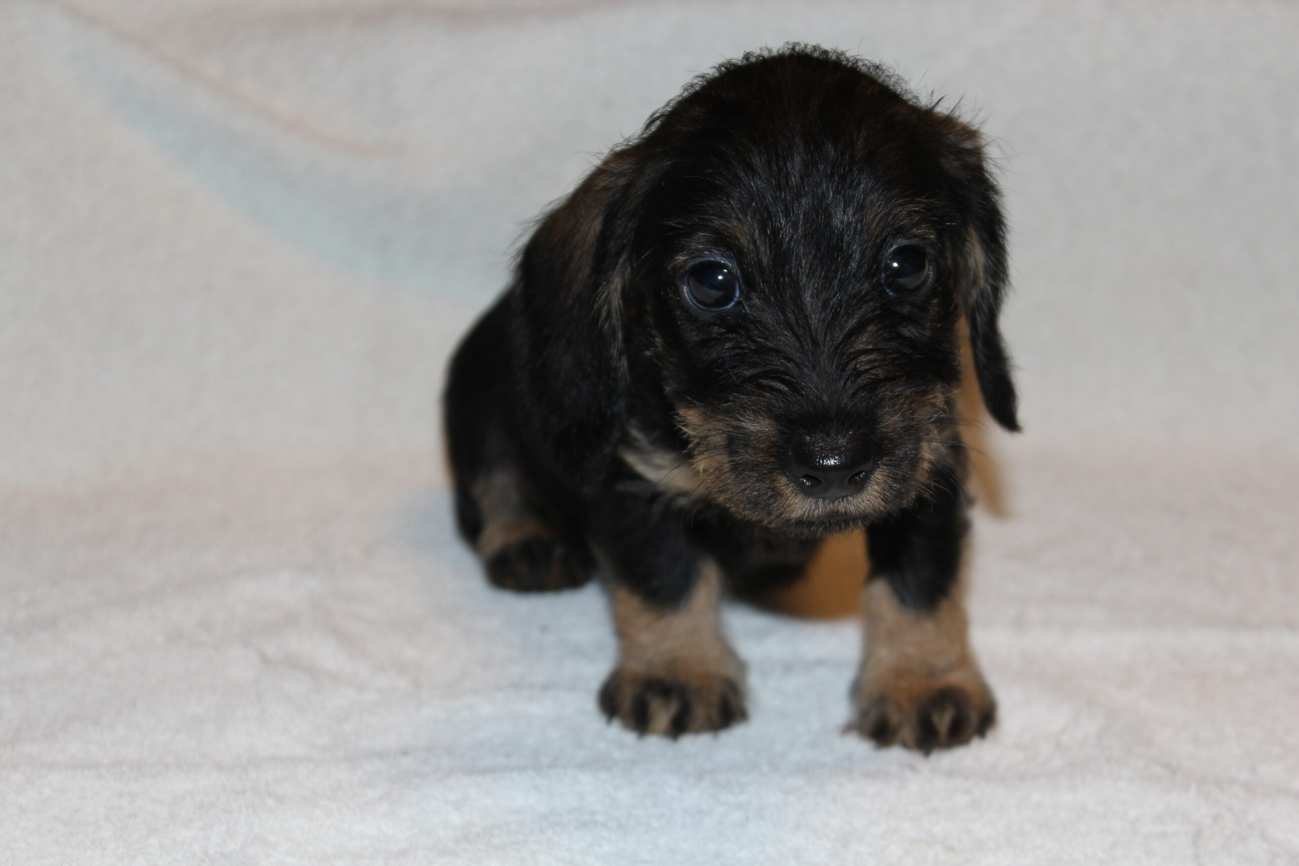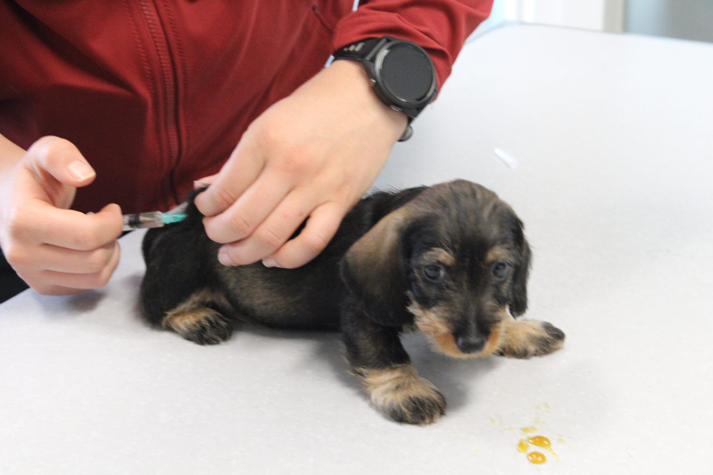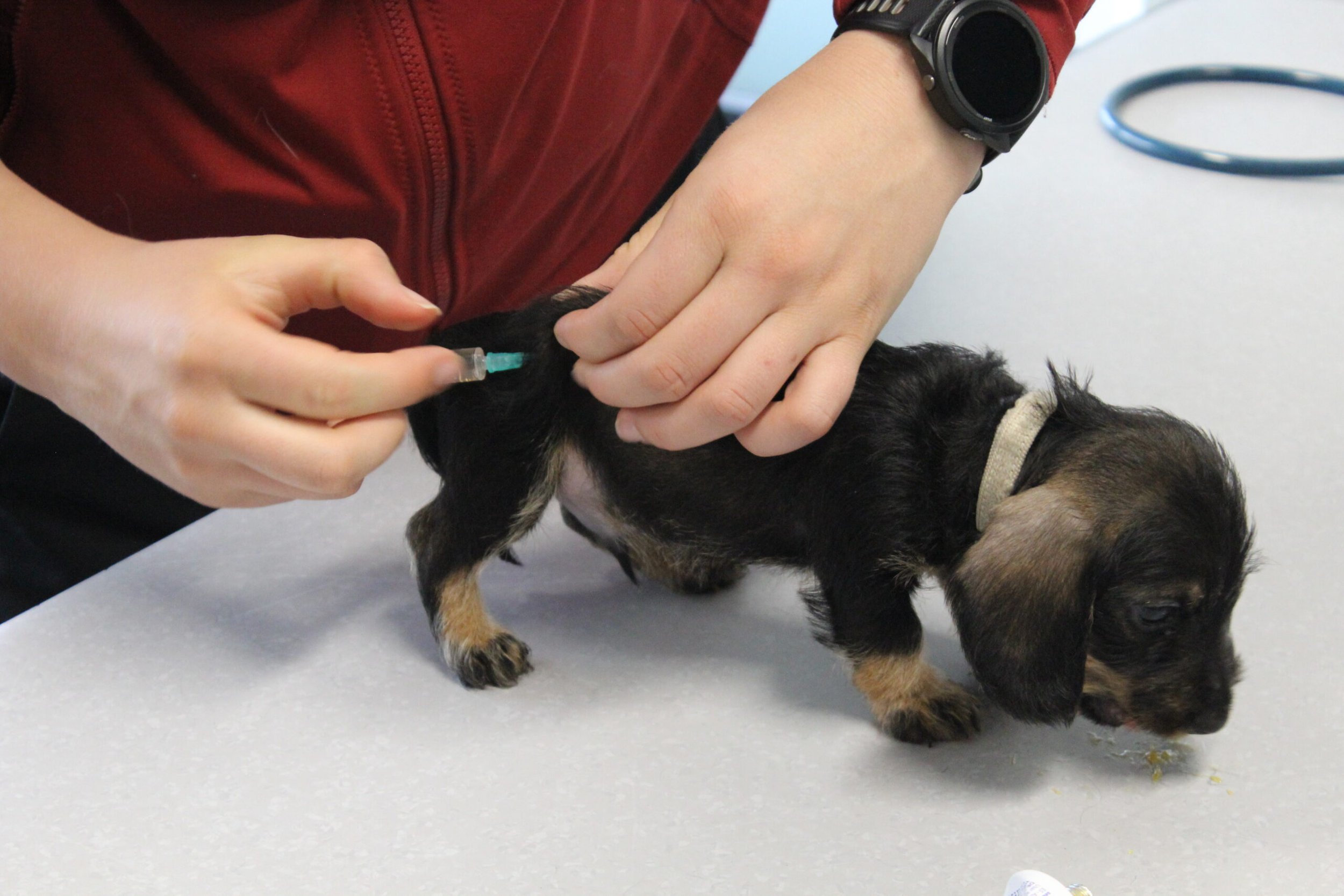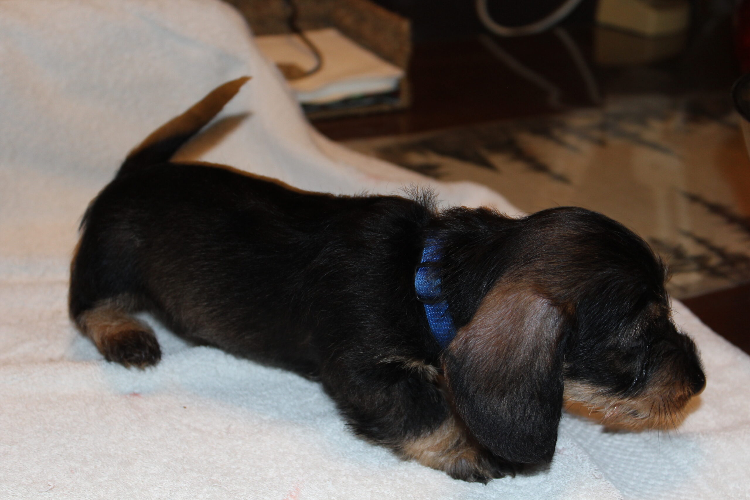 Een week na het bezoek van de chipster voor het chippen en de DNA afname stond nu het bezoek aan de dierenarts op de agenda. Met elkaar in de reisbench op weg voor een eerste bezoek aan de dierenarts. Veel nieuwe indrukken en de kleine rakkertjes keken hun ogen dan ook uit. Het enthousiaste welkom van de assistentes blijft geweldig. Echte teckelgekken, die dit fraais niet kunnen weerstaan. Vervolgens een eerste ontmoeting met een dierenarts. Er werd geklopt, gevoeld en geluisterd. Wat een poppenkast dachten de kleintjes waarschijnlijk, maar voor ons is het toch altijd weer spannend. De dierenarts was wederom zeer tevreden hoe ze er uitzagen en hoe alles het naar behoren deed. Bij de heren waren inmiddels bij alle drie hun balletjes ingedaald. Het was voor de kleintjes een avontuur en je wordt er ook moe van. Op een foto zie je de oogjes van een pup al wat kleiner worden. Ze vonden het mooi geweest en wilden graag weer naar het warme nestje om lekker tegen elkaar aan in slaap te vallen. Ook van de eerste inenting kunnen ze soms iets last hebben dus dan is een heerlijk slaapje altijd welkom. Normaliter hadden ze nu ook hun derde wormenkuur gehad, maar die kregen ze afgelopen zaterdag, omdat alles tegelijkertijd misschien problemen zou kunnen geven. Veiligheid voor alles is ons motto.