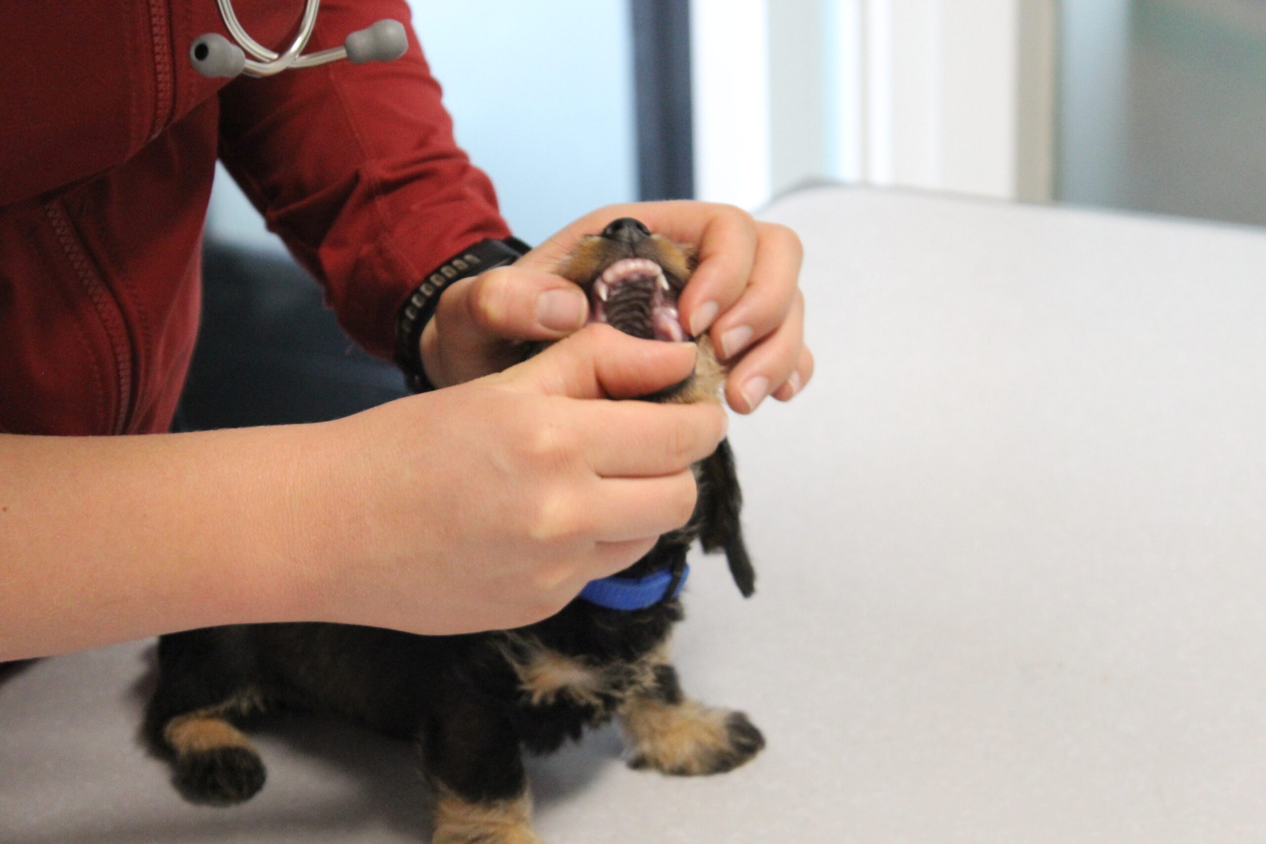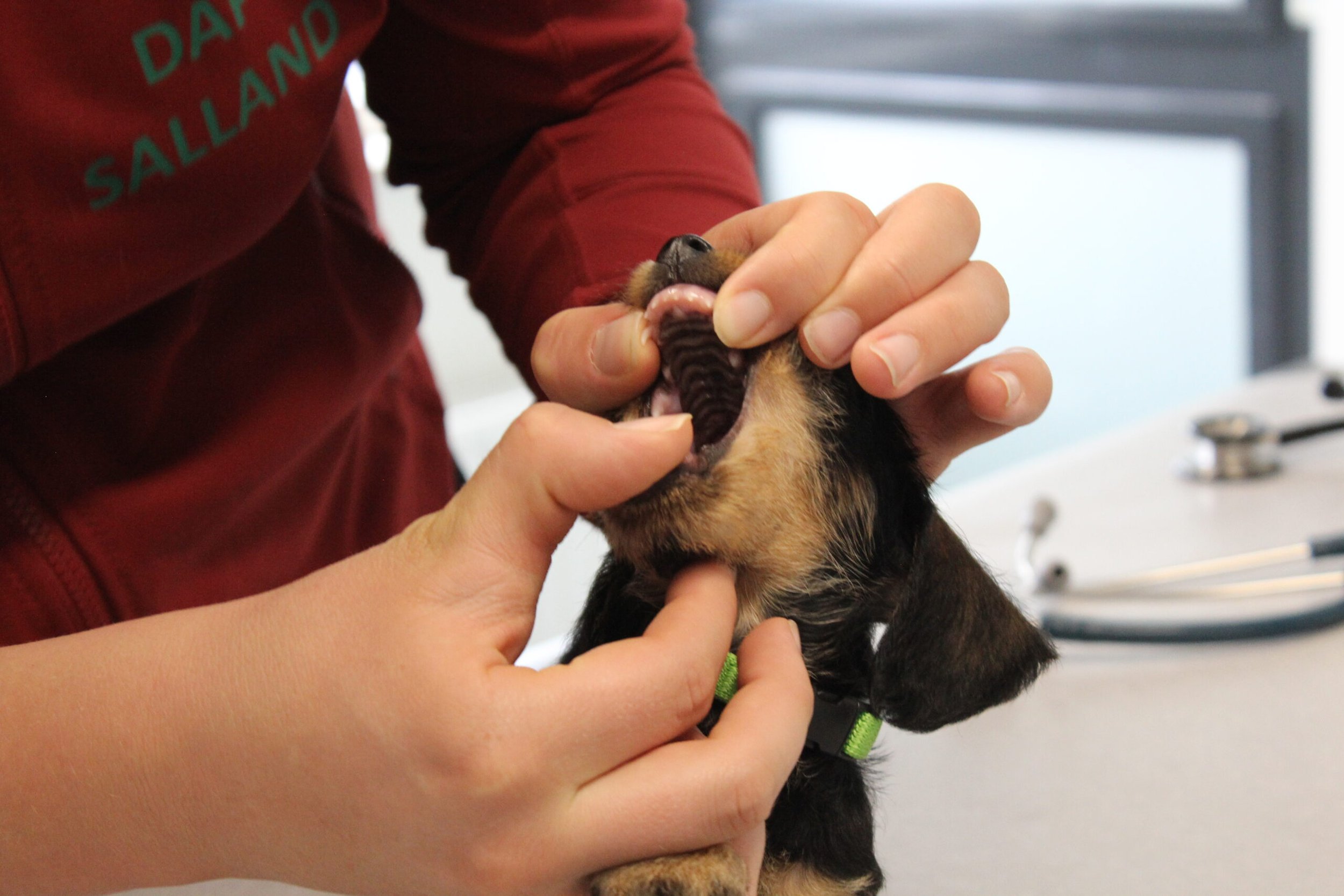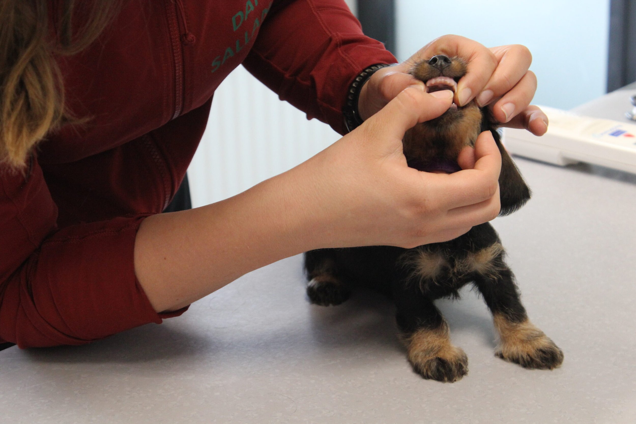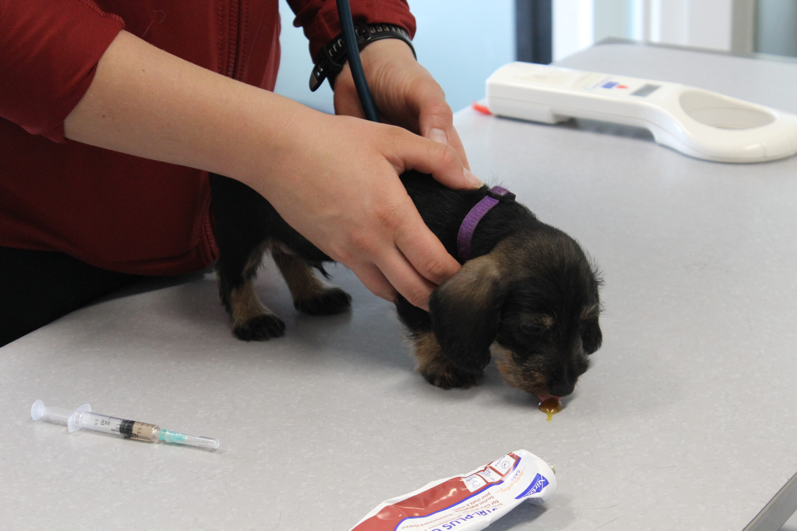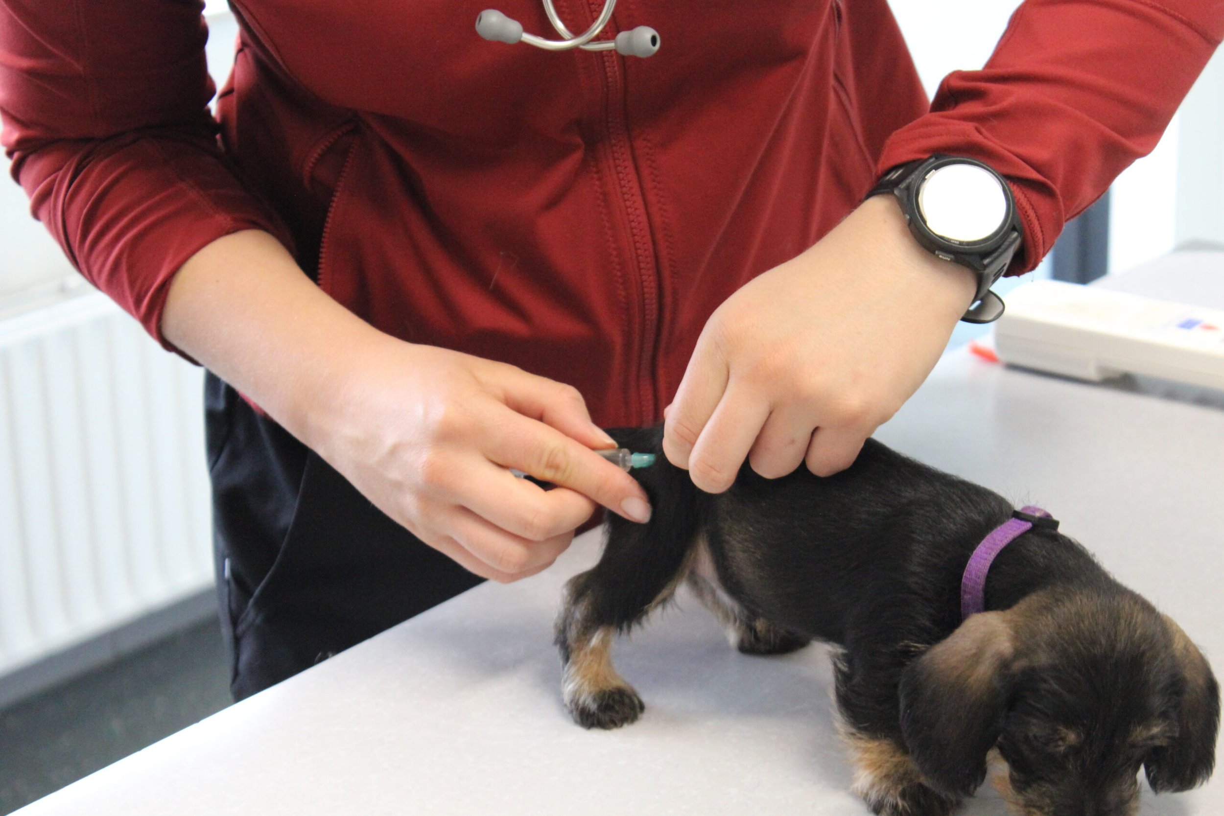 Een week na het bezoek van de chipster voor het chippen en de DNA afname stond nu het bezoek aan de dierenarts op de agenda. Met elkaar in de reisbench op weg voor een eerste bezoek aan de dierenarts. Veel nieuwe indrukken en de kleine rakkertjes keken hun ogen dan ook uit. Het enthousiaste welkom van de assistentes blijft geweldig. Echte teckelgekken, die dit fraais niet kunnen weerstaan. Vervolgens een eerste ontmoeting met een dierenarts. Er werd geklopt, gevoeld en geluisterd. Wat een poppenkast dachten de kleintjes waarschijnlijk, maar voor ons is het toch altijd weer spannend. De dierenarts was wederom zeer tevreden hoe ze er uitzagen en hoe alles het naar behoren deed. Bij de heren waren inmiddels bij alle drie hun balletjes ingedaald. Het was voor de kleintjes een avontuur en je wordt er ook moe van. Op een foto zie je de oogjes van een pup al wat kleiner worden. Ze vonden het mooi geweest en wilden graag weer naar het warme nestje om lekker tegen elkaar aan in slaap te vallen. Ook van de eerste inenting kunnen ze soms iets last hebben dus dan is een heerlijk slaapje altijd welkom. Normaliter hadden ze nu ook hun derde wormenkuur gehad, maar die kregen ze afgelopen zaterdag, omdat alles tegelijkertijd misschien problemen zou kunnen geven. Veiligheid voor alles is ons motto.