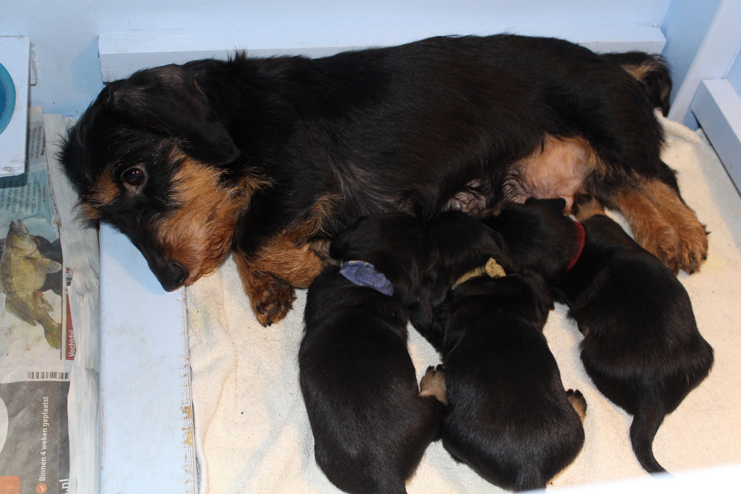 Als je het groeien van de pups zou kunnen horen dan werd het best wel lawaaierig in onze woonkamer. Ze groeien als kool en doen het volgens het boekje. Inmiddels lopen ze en spelen de pups volop met elkaar. Nog even dan begint mama Julia af te bouwen met de borstvoeding. De kleintjes zullen de Carnibest en de brokjes dan hebben ontdekt. Ook leren ze dan van mama dat ze hun nest niet mogen bevuilen en dat ze gebruik dienen te maken van de krant voor in de werpkist. Het is zo mooi om te zien hoe snel ze dit oppikken. Het wil natuurlijk niet zeggen dat er niet eens een ongelukje gebeurt, maar al doende leren de pups het zeker. Ook bij de nieuwe baasjes zal er nog zeker wel eens een ongelukje kunnen plaatsvinden, maar ook hier geldt dat ze het snel zullen leren. Heb geduld nieuwe baasjes, het gaat snel genoeg. En ja, de ene pup is sneller dan de andere pup.