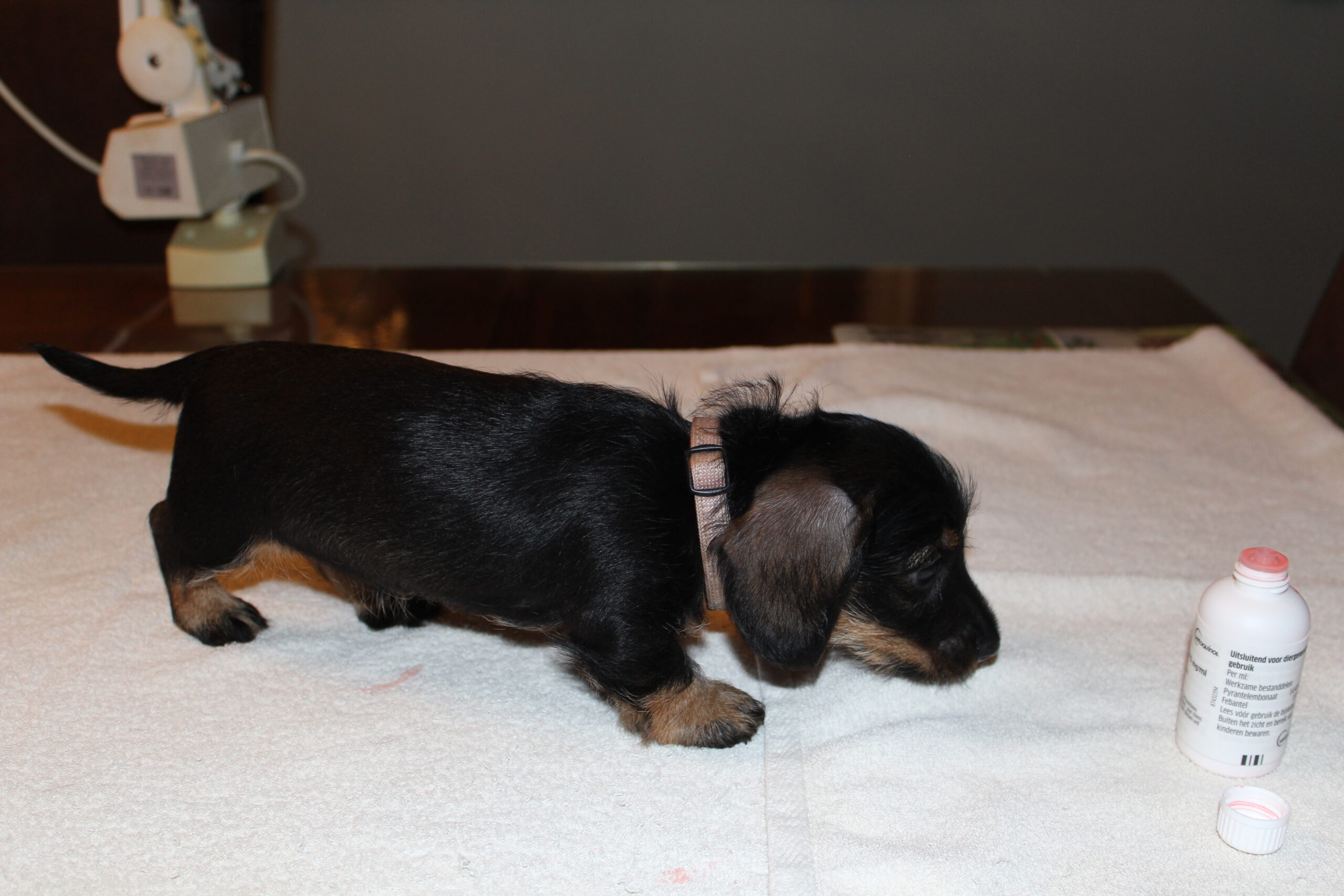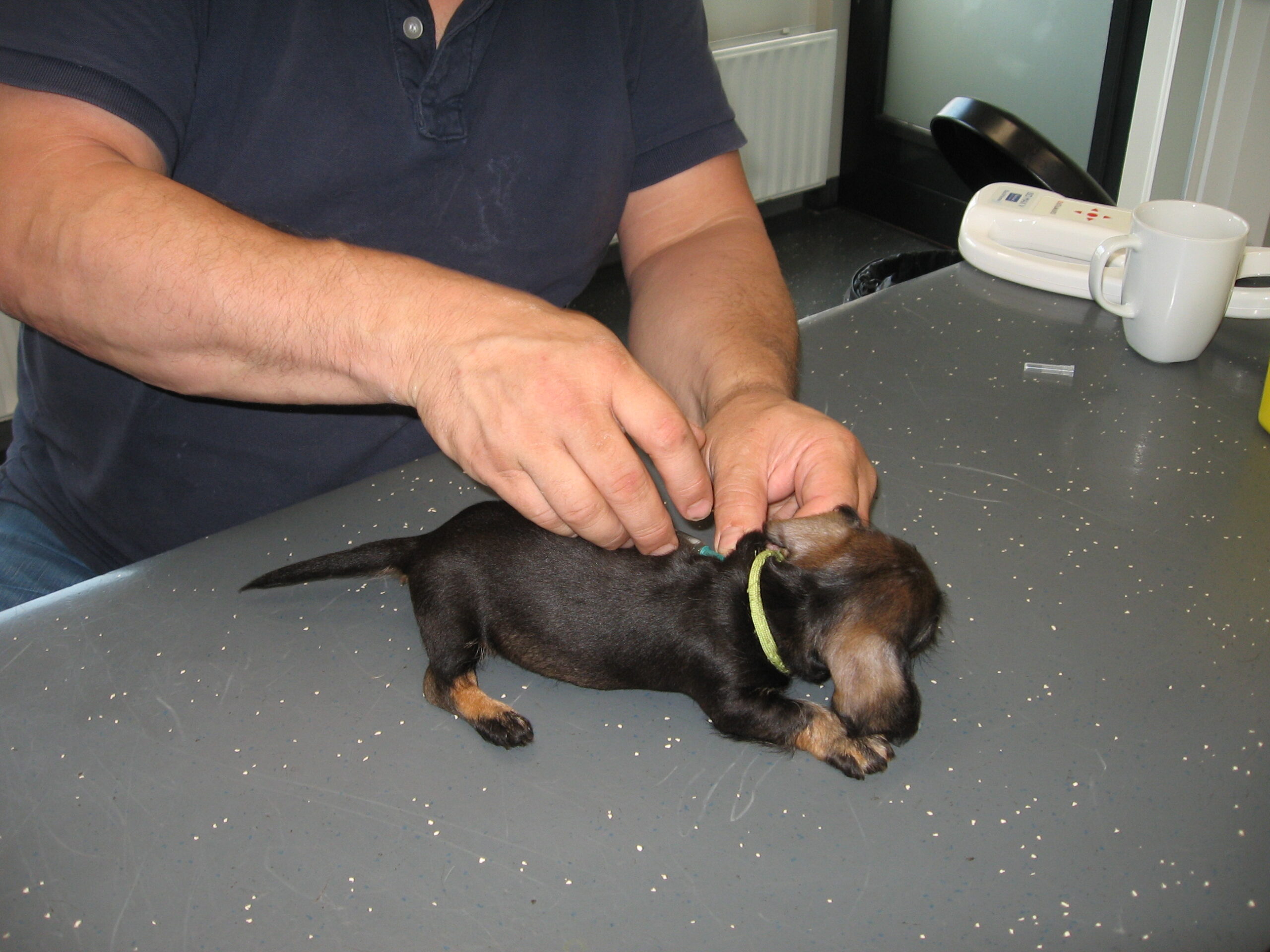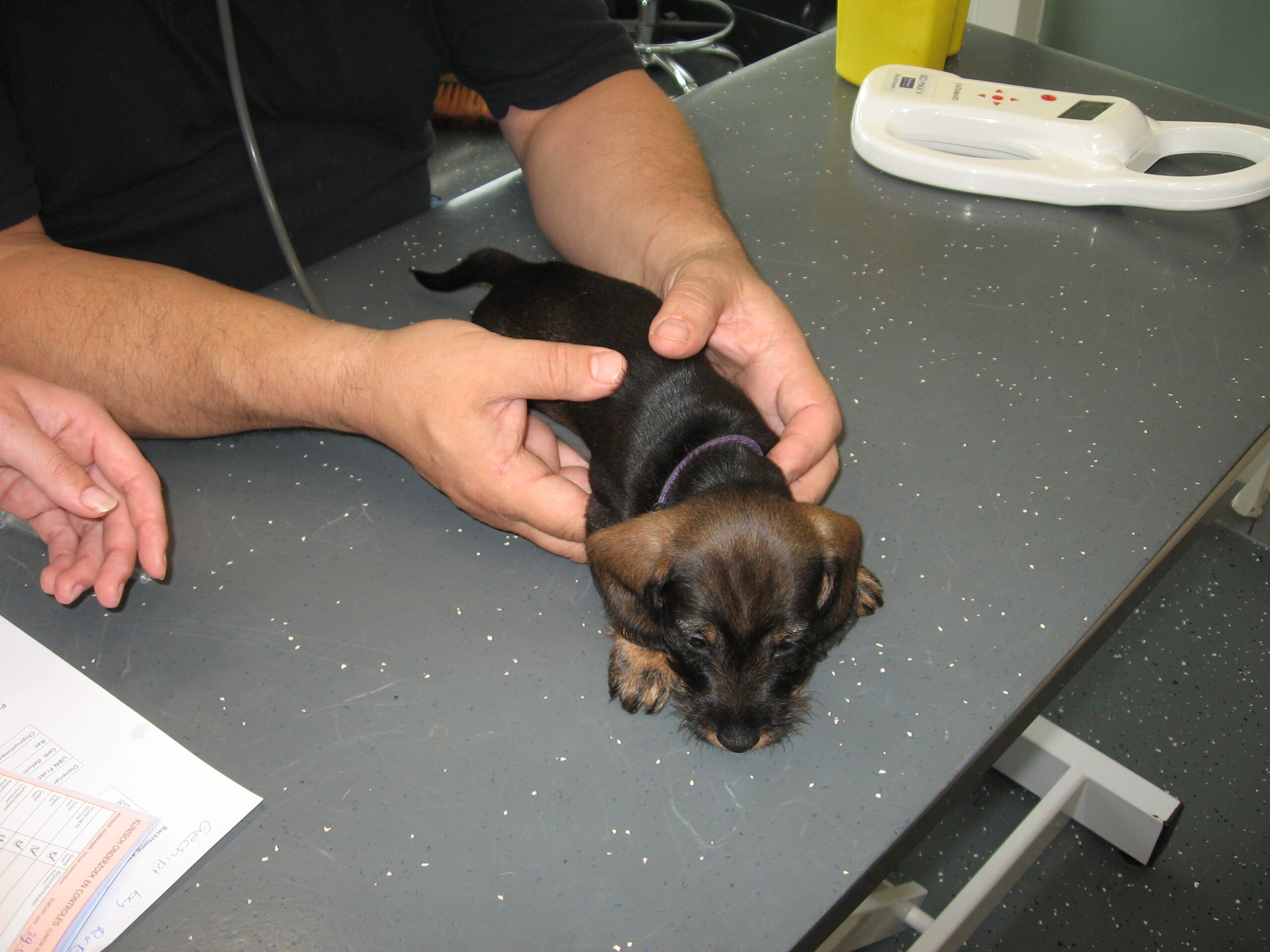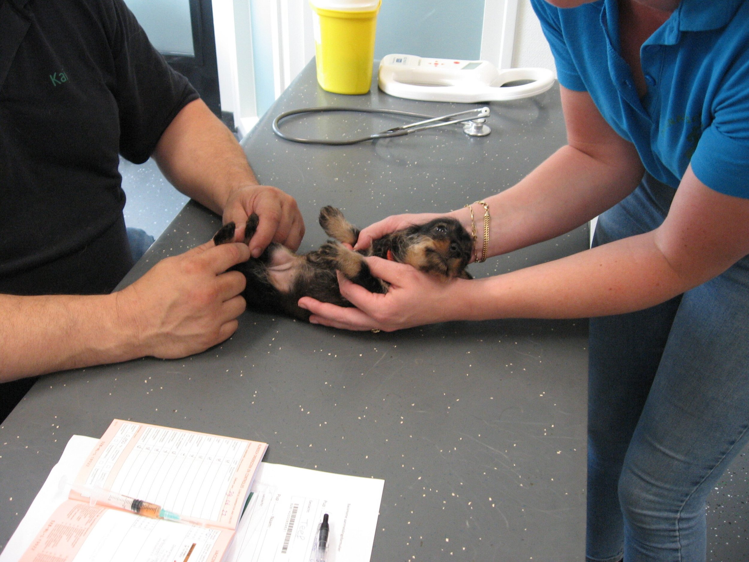 Daarop brak de tweede week aan; week 6. Dat betekent de eerste inenting en de eerste lichamelijke controle. Dinsdag was Julia met haar kroost aan de beurt. Alles gereed gemaakt, pups in de reisbench en mama Julia aan de riem en samen naar de dierenarts. Nadat alle dierenpaspoorten gereed waren gemaakt, ging het naar de spreekkamer waar de eerste pup tevoorschijn werd gehaald. Eerst even wegen en aansluitend een algehele lichamelijke controle; oogjes, oren, gebit. De buikjes worden aan een onderzoek blootgesteld of er mogelijk een navelbreukje aanwezig is – komt nog wel eens voor – of dat het buikje niet soepel aanvoelt. Daarna wordt er bij de reutjes gecontroleerd of de balletjes goed zijn ingedaald en daarna wordt er een algeheel oordeel over de pup gegeven. Dit alles wordt door de assistent in het dierenpaspoort genoteerd. Daarna wordt de chip nog even gecontroleerd en als alles oké bevonden is, volgt de eerste vaccinatie. Hierna gaat de pup weer terug in de reisbench en is de volgende pup aan de beurt. Zo volgt voor iedere pup hetzelfde ritueel. Als laatste is mama Julia aan de beurt. Ook zij wordt nog even goed gecontroleerd en ook bij haar zijn er geen ‘rare’ dingen gevonden. Even de kas van de dierenarts aanvullen en dan weer snel naar huis waar ik ongeduldig zit te wachten om de uitslag van Bert te vernemen: alles oké!