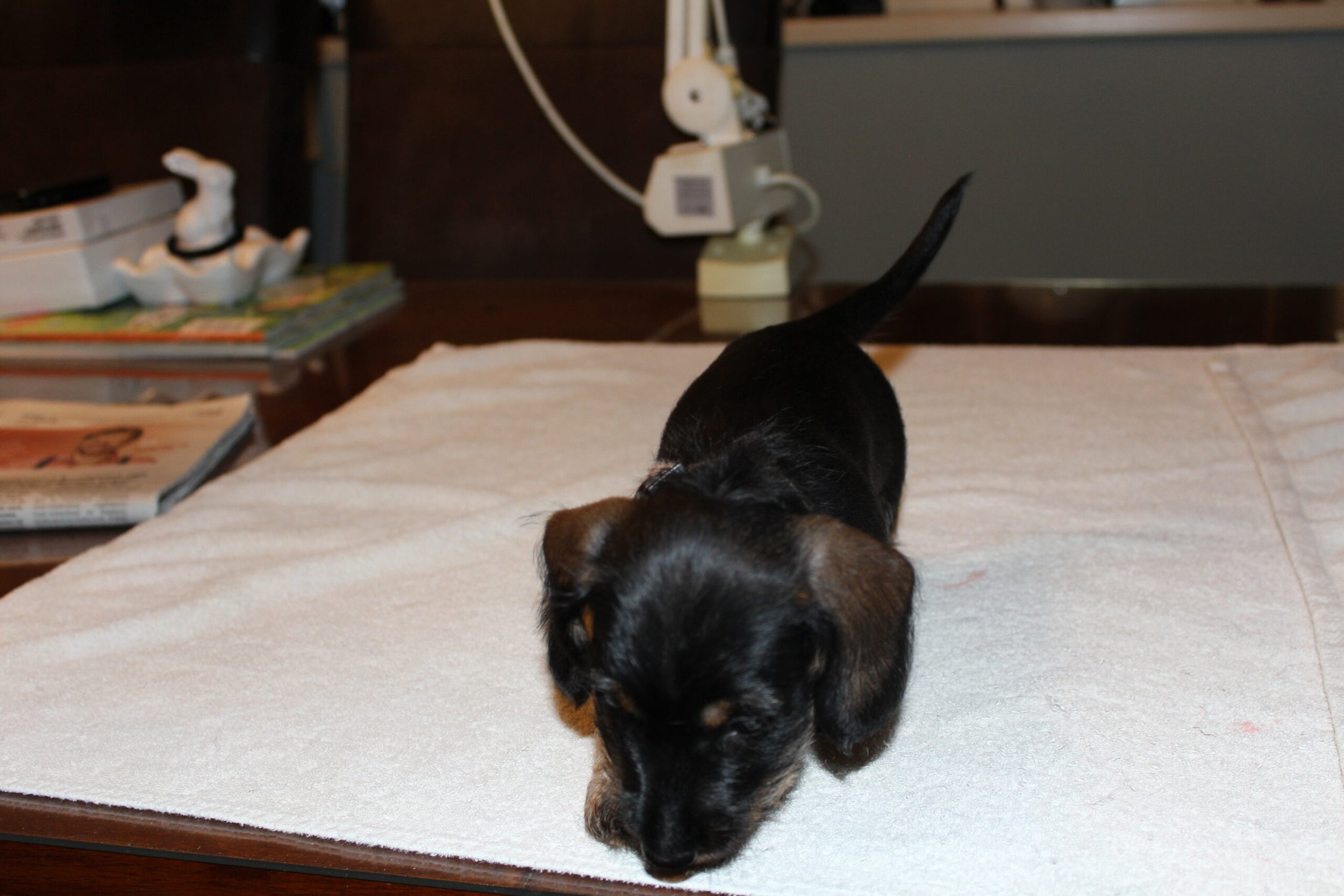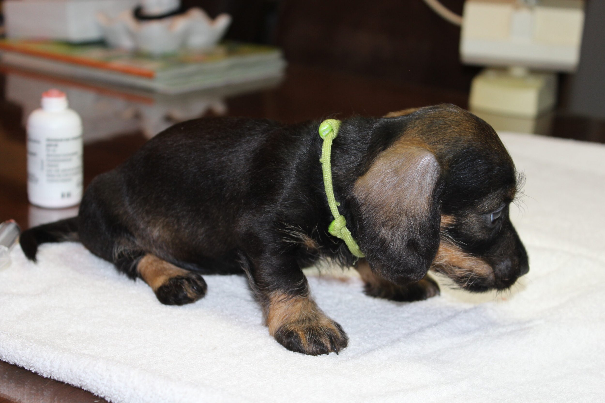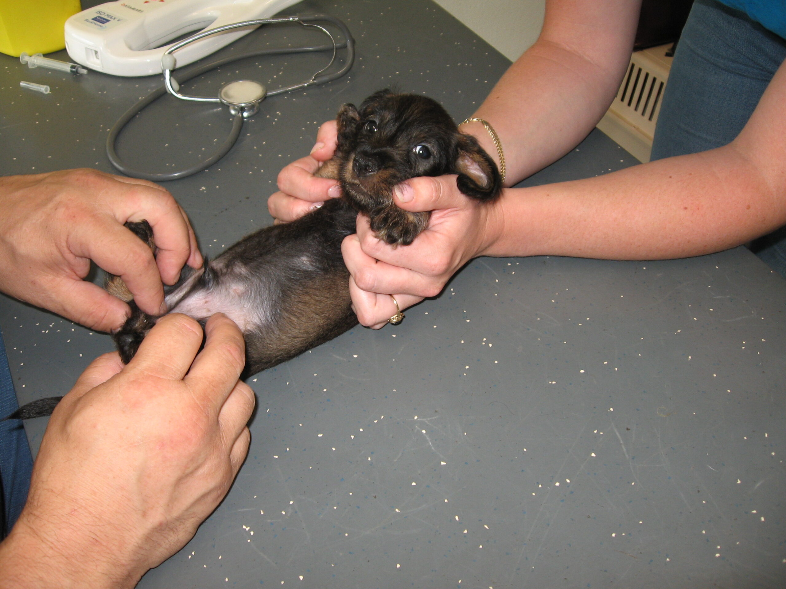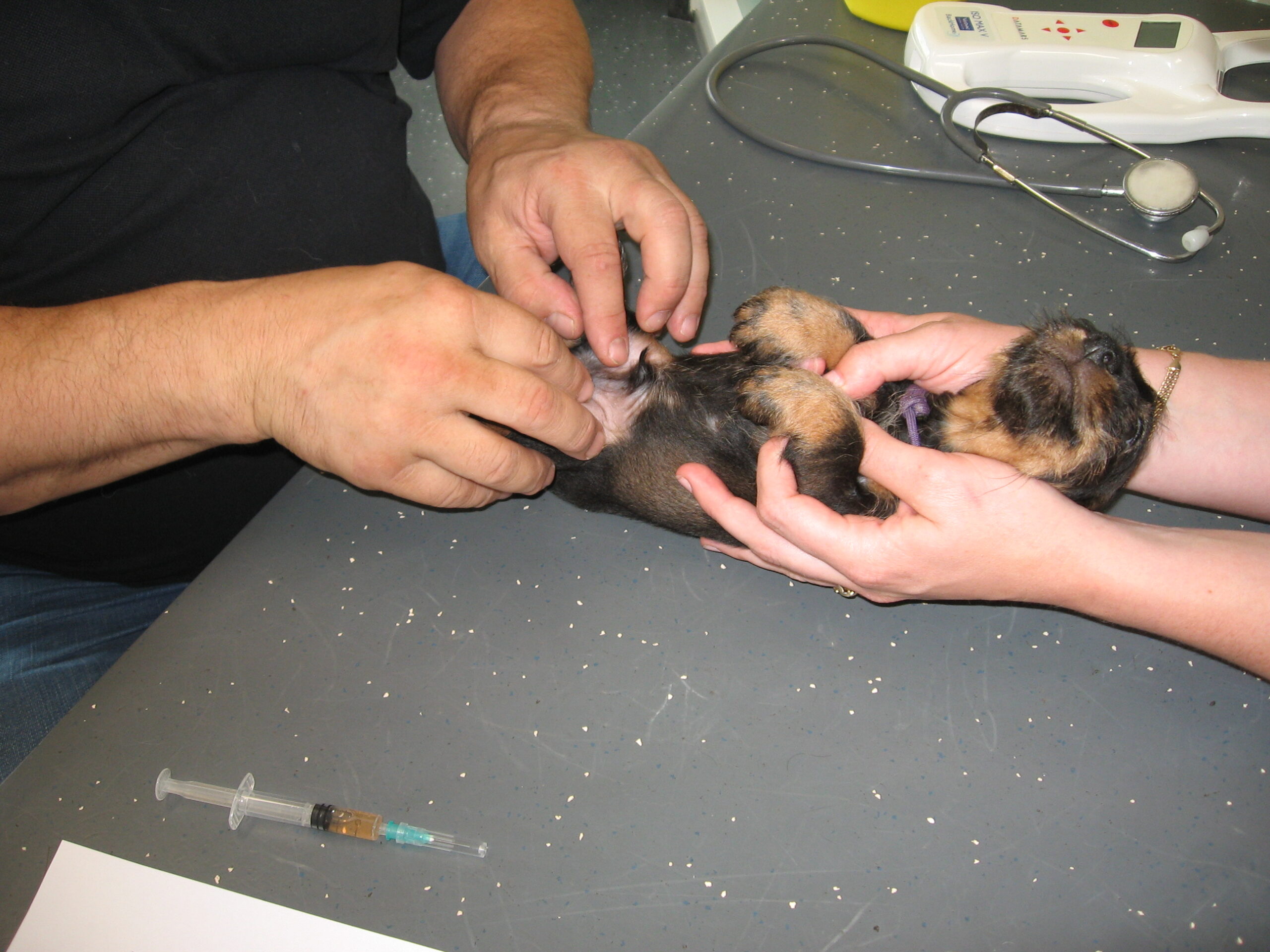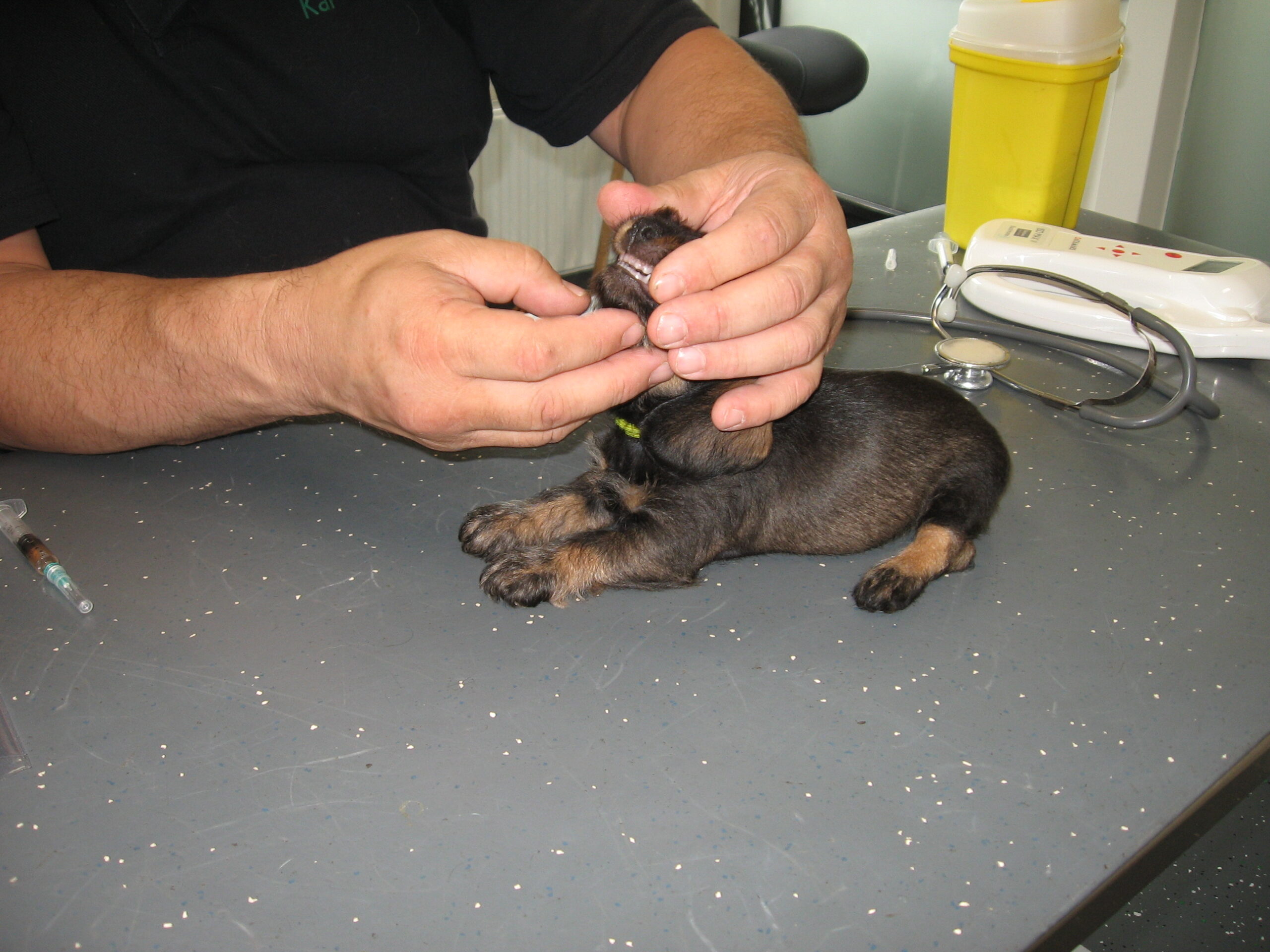 Daarop brak de tweede week aan; week 6. Dat betekent de eerste inenting en de eerste lichamelijke controle. Dinsdag was Julia met haar kroost aan de beurt. Alles gereed gemaakt, pups in de reisbench en mama Julia aan de riem en samen naar de dierenarts. Nadat alle dierenpaspoorten gereed waren gemaakt, ging het naar de spreekkamer waar de eerste pup tevoorschijn werd gehaald. Eerst even wegen en aansluitend een algehele lichamelijke controle; oogjes, oren, gebit. De buikjes worden aan een onderzoek blootgesteld of er mogelijk een navelbreukje aanwezig is – komt nog wel eens voor – of dat het buikje niet soepel aanvoelt. Daarna wordt er bij de reutjes gecontroleerd of de balletjes goed zijn ingedaald en daarna wordt er een algeheel oordeel over de pup gegeven. Dit alles wordt door de assistent in het dierenpaspoort genoteerd. Daarna wordt de chip nog even gecontroleerd en als alles oké bevonden is, volgt de eerste vaccinatie. Hierna gaat de pup weer terug in de reisbench en is de volgende pup aan de beurt. Zo volgt voor iedere pup hetzelfde ritueel. Als laatste is mama Julia aan de beurt. Ook zij wordt nog even goed gecontroleerd en ook bij haar zijn er geen ‘rare’ dingen gevonden. Even de kas van de dierenarts aanvullen en dan weer snel naar huis waar ik ongeduldig zit te wachten om de uitslag van Bert te vernemen: alles oké!