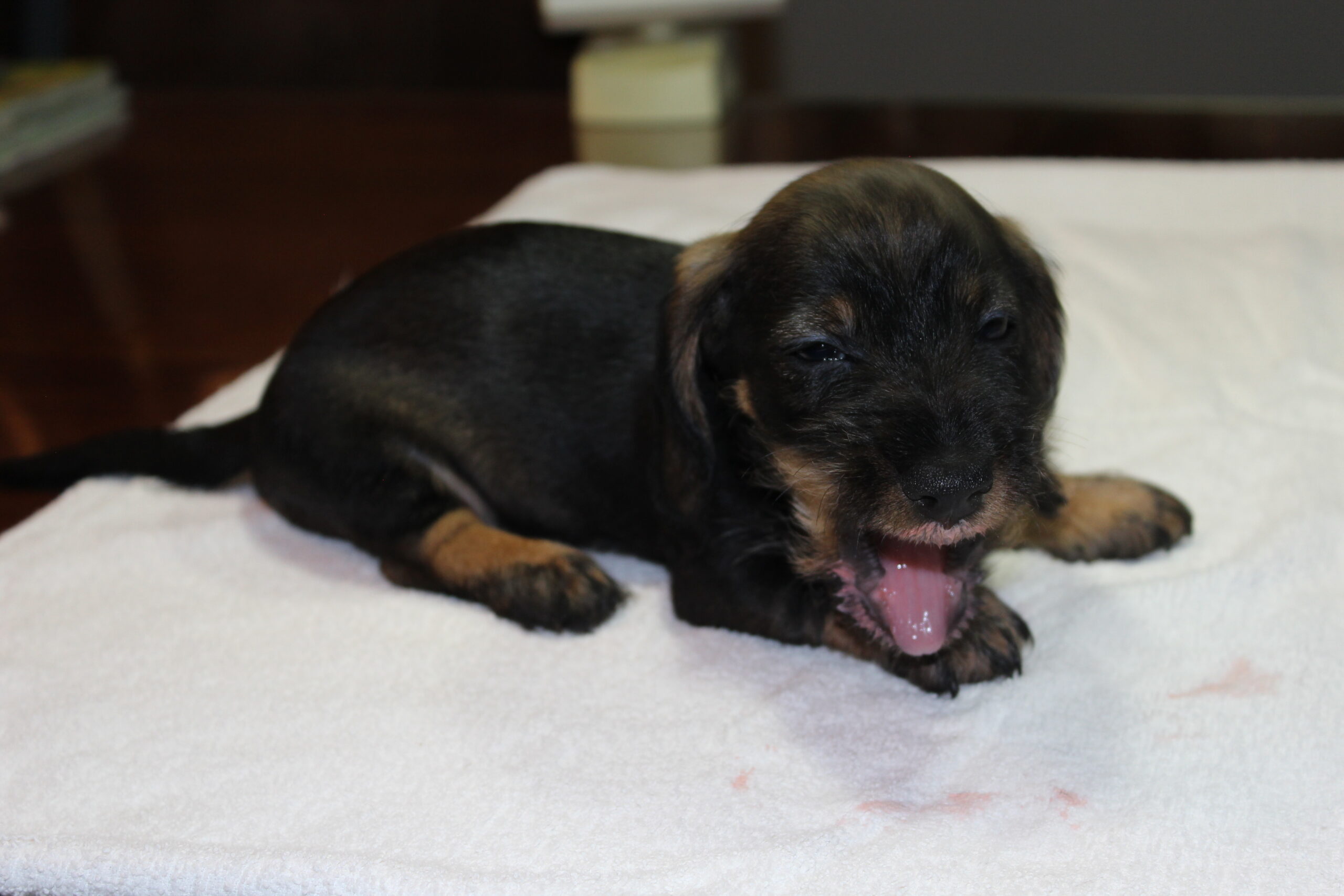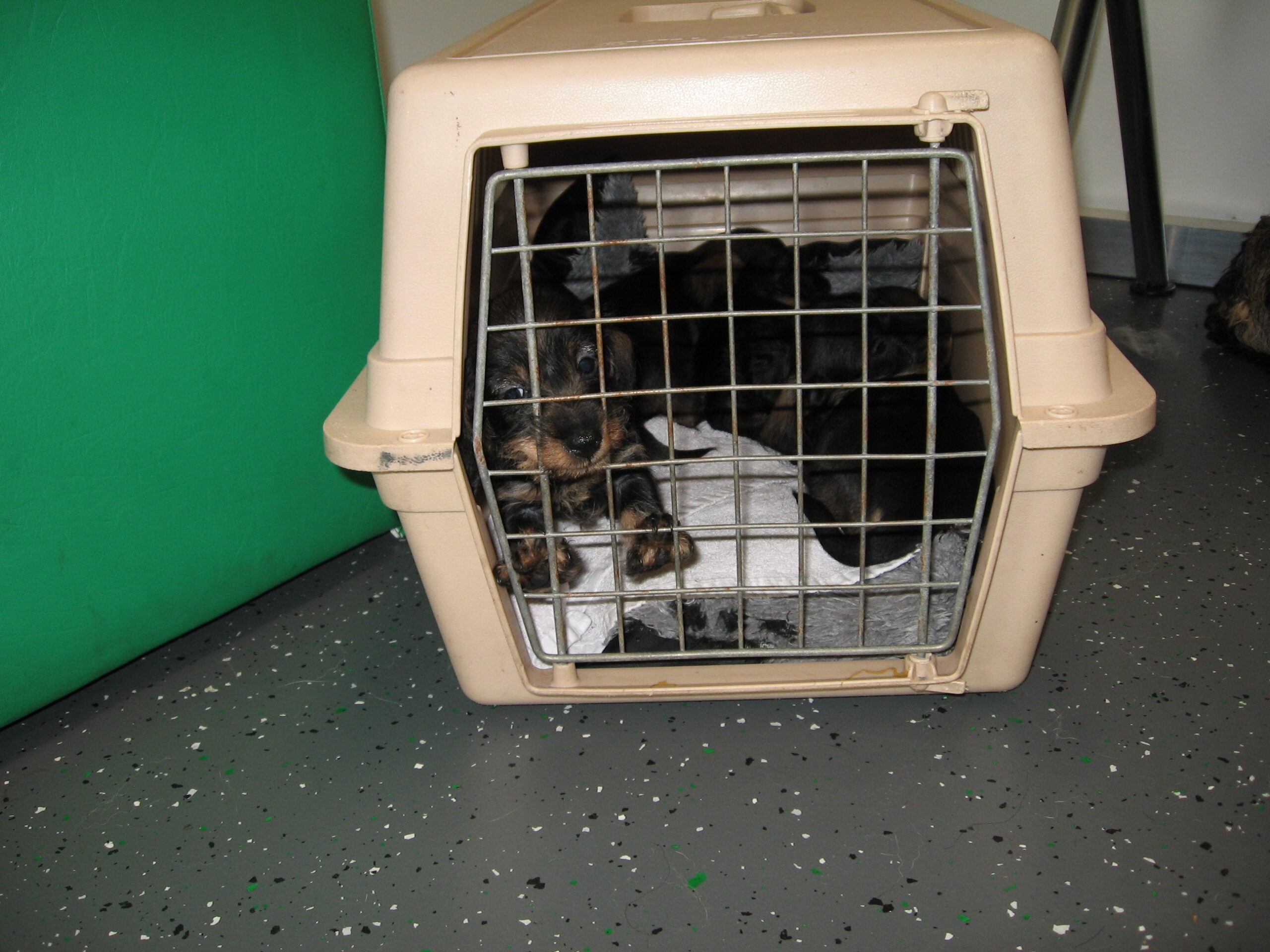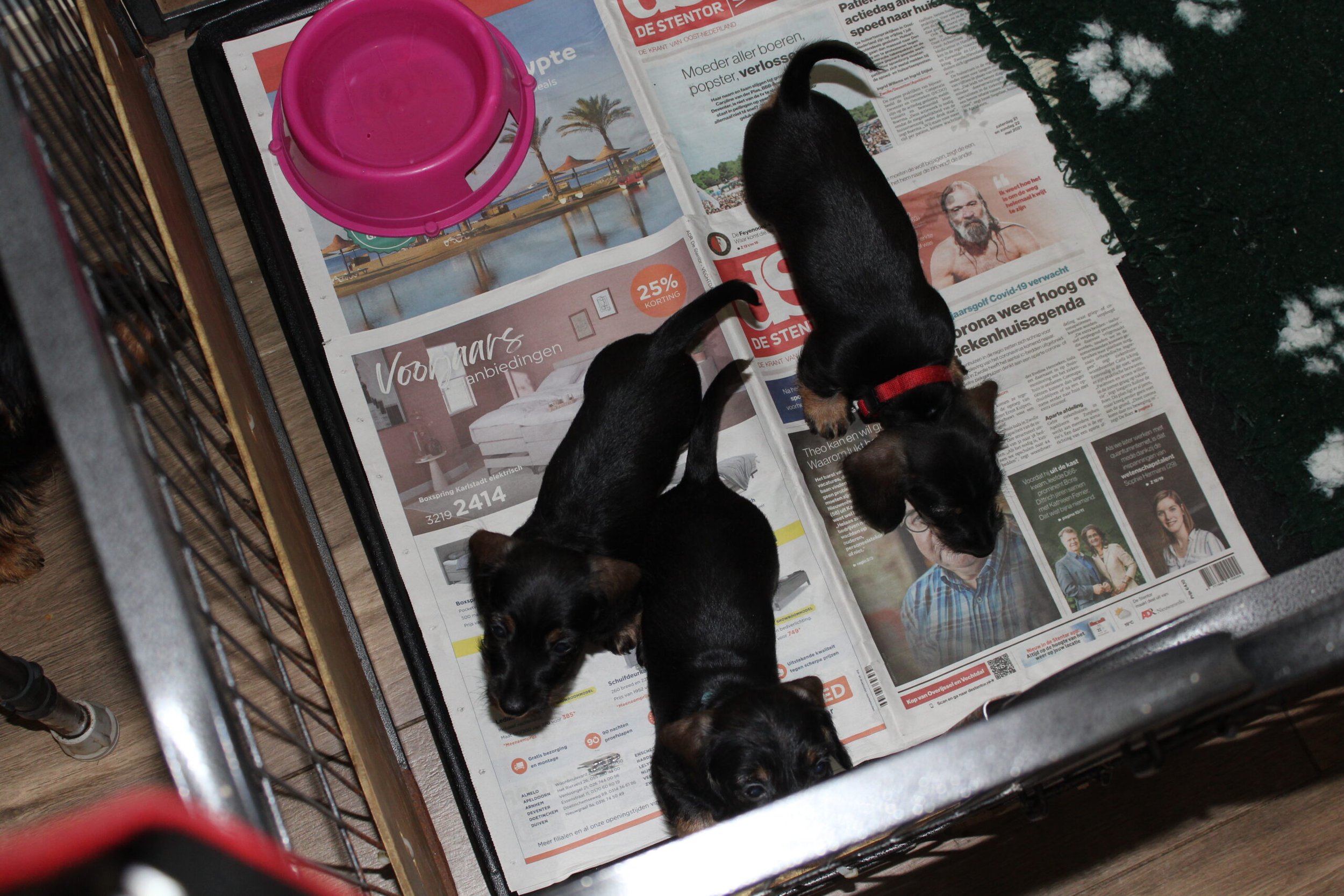 Daar zit ik dan weer om vele beloftes voor een verhaaltje na te komen. Geen probleem hoor, dat doe ik met plezier. Tussen alle dierengeluiden en het journaal door probeer ik jullie wederom op de hoogte te brengen van onze pupsels. Wat waren het weer drukke maar oh zo leuke twee weken. De eerste week begon met het bezoek van de chipster. Vakkundig werden de pups gechipt en werd het DNA afgenomen, maar we waren er nog niet. Terwijl de pups bijkwamen van deze nieuwe ervaringen gaf ze ons nog wat advies over de huisvesting van de pups. De werpkisten staan hoog, zodat Bert tijdens de bevalling geen last van zijn rug krijgt. Jullie zullen begrijpen dat dit een zorgvuldig en een langdurend proces is en onze meisjes blijven rustig en tevreden zo lang Bert er maar bij is en dan moet je wel op de rug blijven letten. De chipster adviseerde ons om de pups eerder in de kamerkennel te doen, zodat zij de kamer eerder zouden kunnen bekijken. Bij ons gebeurt dit normaliter na de enting, maar dit advies volgen wij graag op. Alles voor het welzijn van de pups en mama, die regelmatig de beentjes buiten de werpkist kan strekken en dan ook al graag op schoot ligt. Vervolgens kregen wij daarna een locatiecontrole en werd het verblijf van de honden bekeken en werd de buitenkennel geïnspecteerd. De waterbak stond op dat moment niet op de juiste plek, maar water is er altijd. Haar adviezen werden gerapporteerd aan de Raad van Beheer en vanmorgen (29/6) ontvingen wij een mail van de jurist van de Raad van Beheer dat zij verheugd waren dat onze locatie voldoet aan de gestelde eisen. Er kan in de toekomst altijd nog steekproefsgewijs een locatiecontrole plaatsvinden. Prima voor het honden- c.q. dierenwelzijn en wij zijn dan ook erg blij met deze beoordeling en zullen er zeker op toezien dat dit blijvend is. Met dank aan de chipster en de Raad van Beheer.