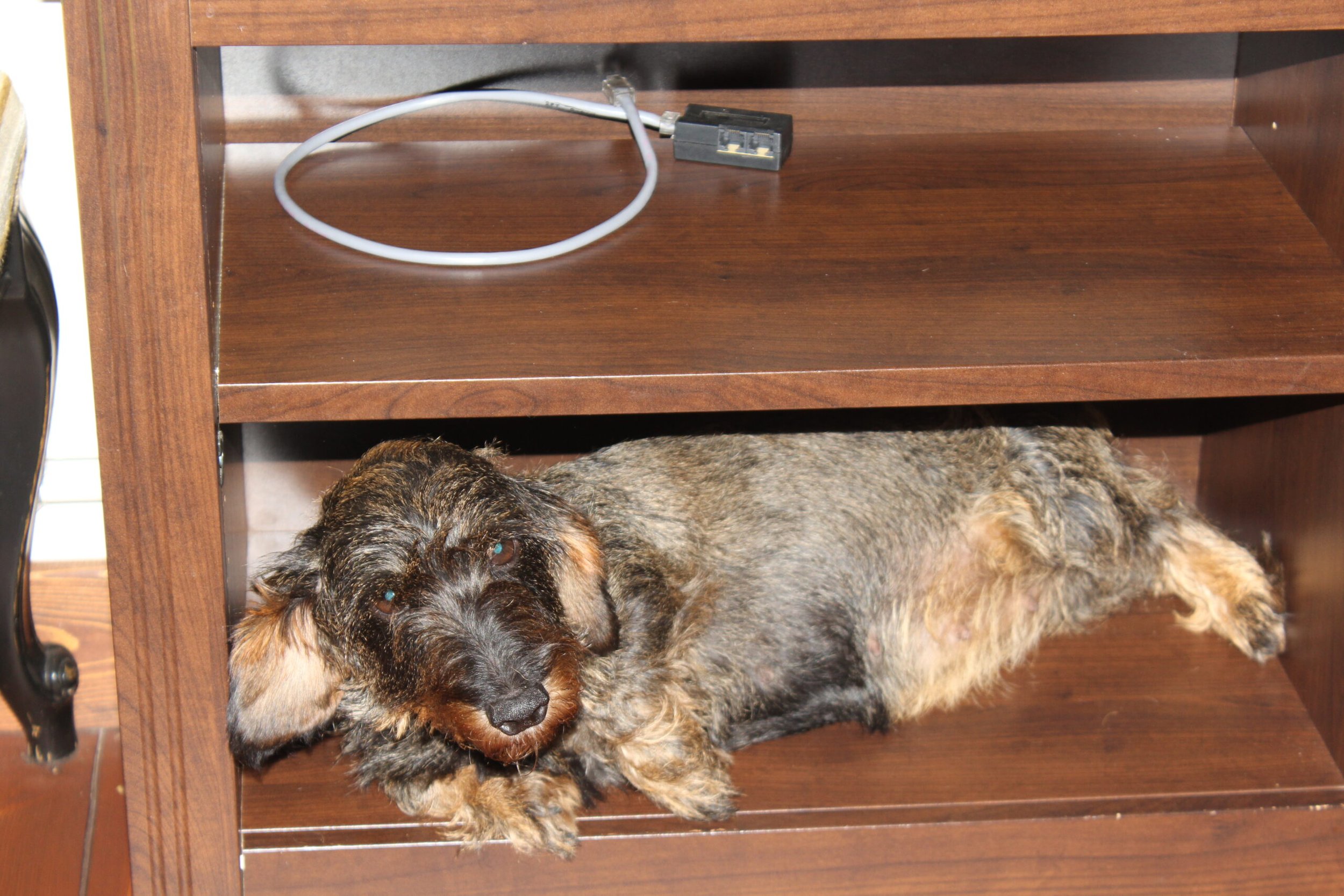 Hierbij een foto van ons 'blije ei' Fleur. Ze heeft haar rustige plekje gevonden om de nodige dutjes te doen.