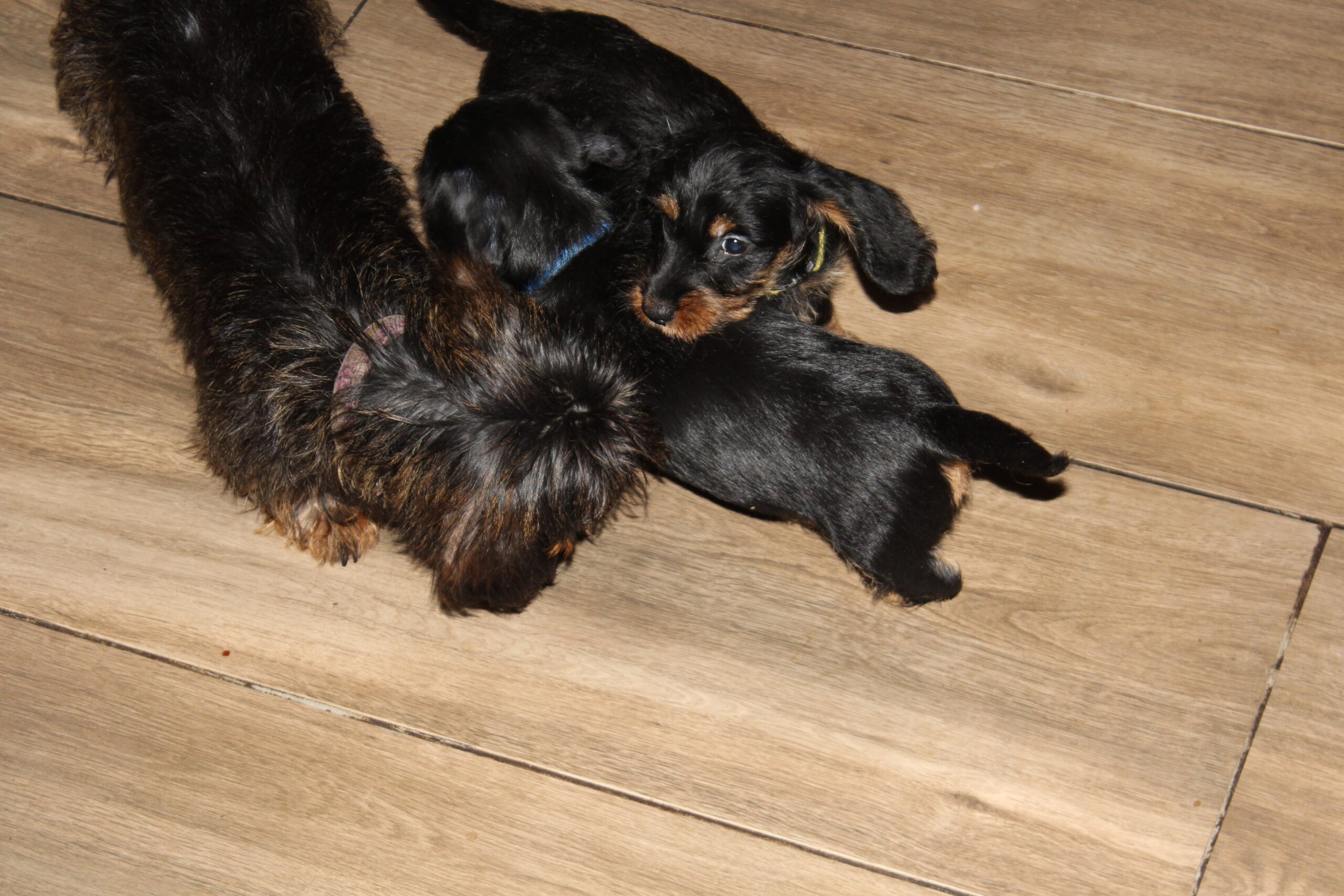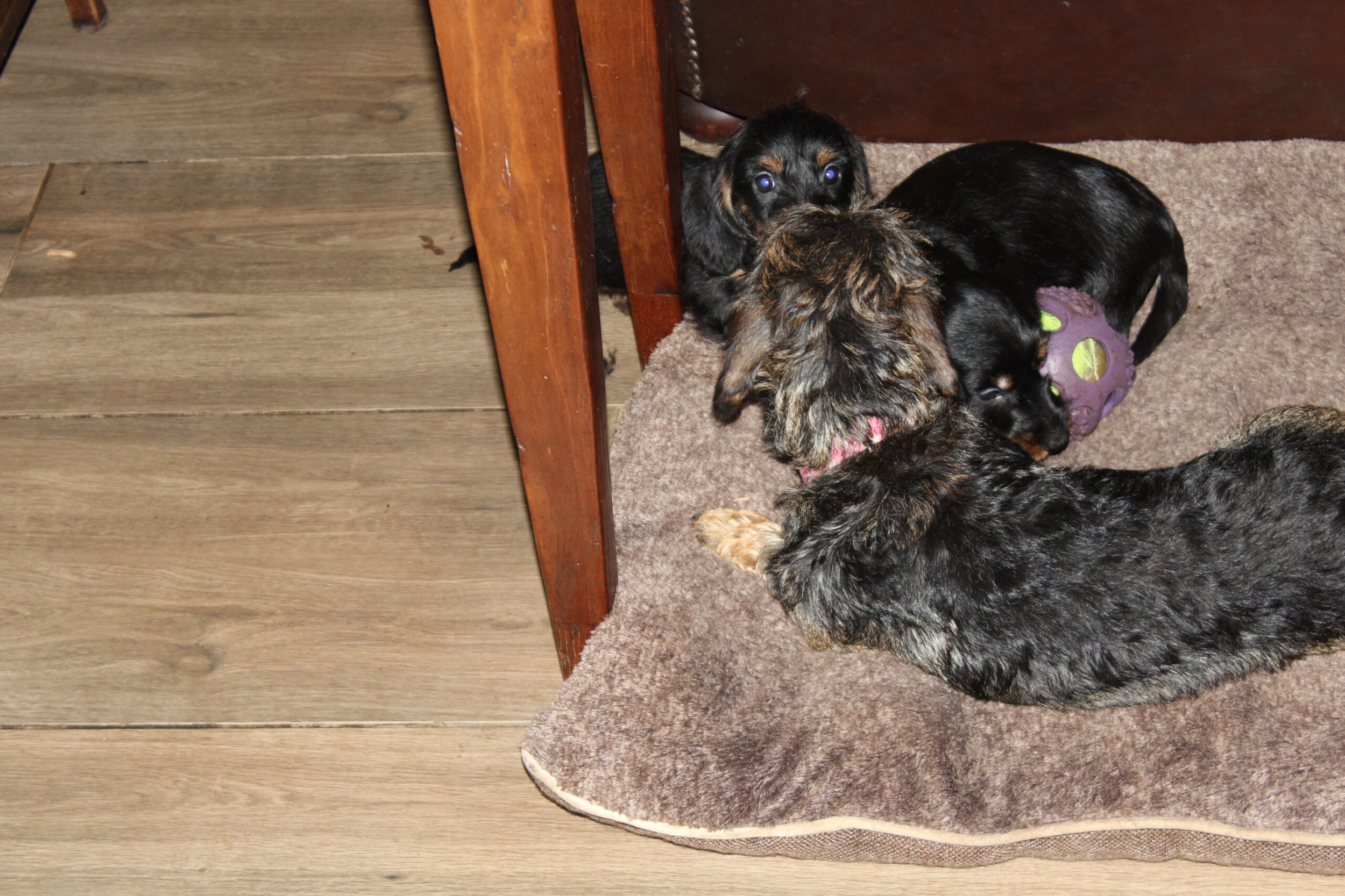 Daar zit ik weer achter mijn laptop om jullie allemaal verslag te doen van de twee kanjers Tax en Muts. Wat een heerlijk stel, die over niet al te lange tijd onze boerderij zullen verlaten. Nu nog rechts van mij heerlijk aan het spelen en nog even later lekker slapen. Knuffelen vinden ze heerlijk, maar het ravotten in de kamer en vanmiddag weer met enkele teckels uit de roedel is natuurlijk geweldig. Wat een energie in die kleinere lijfjes. Alles is spannend en het ontdekken waard. Heel belangrijk dat ze al die ervaringen opdoen. Voor de nieuwe baasjes ook de schone taak deze socialisatie voort te zetten, zodat hun lieverd opgroeit tot een stabiele en evenwichtige hond. Dat gaat zeker lukken, want wie wil dit nu niet. Hier is de basis gelegd en daar kan men met plezier op voortbouwen. Laat ze kennis maken met vele situaties en begeleid ze daarin en doe dit indien mogelijk op een puppycursus. De vele trainers aldaar kunnen je daarover goed adviseren en daarin bijstaan. Wie wil nou niet een geweldig kameraadje voor het leven. Waar nodig staan wij de baasjes altijd graag bij. Een mailtje of telefoontje is genoeg om bij vragen te worden geholpen. Ja, ze blijven altijd in onze Aan den Voorhoeve familie. Missen zullen we zeker ook Tax en Muts. Na zoveel weken zitten ze al diep in ons hart en daarom horen we dan ook graag hoe het met de honden gaat eenmaal bij de nieuwe baasjes. Gelukkig laten vele baasjes met enige regelmaat wat over hun lieverd(s) horen. Zo fijn.
