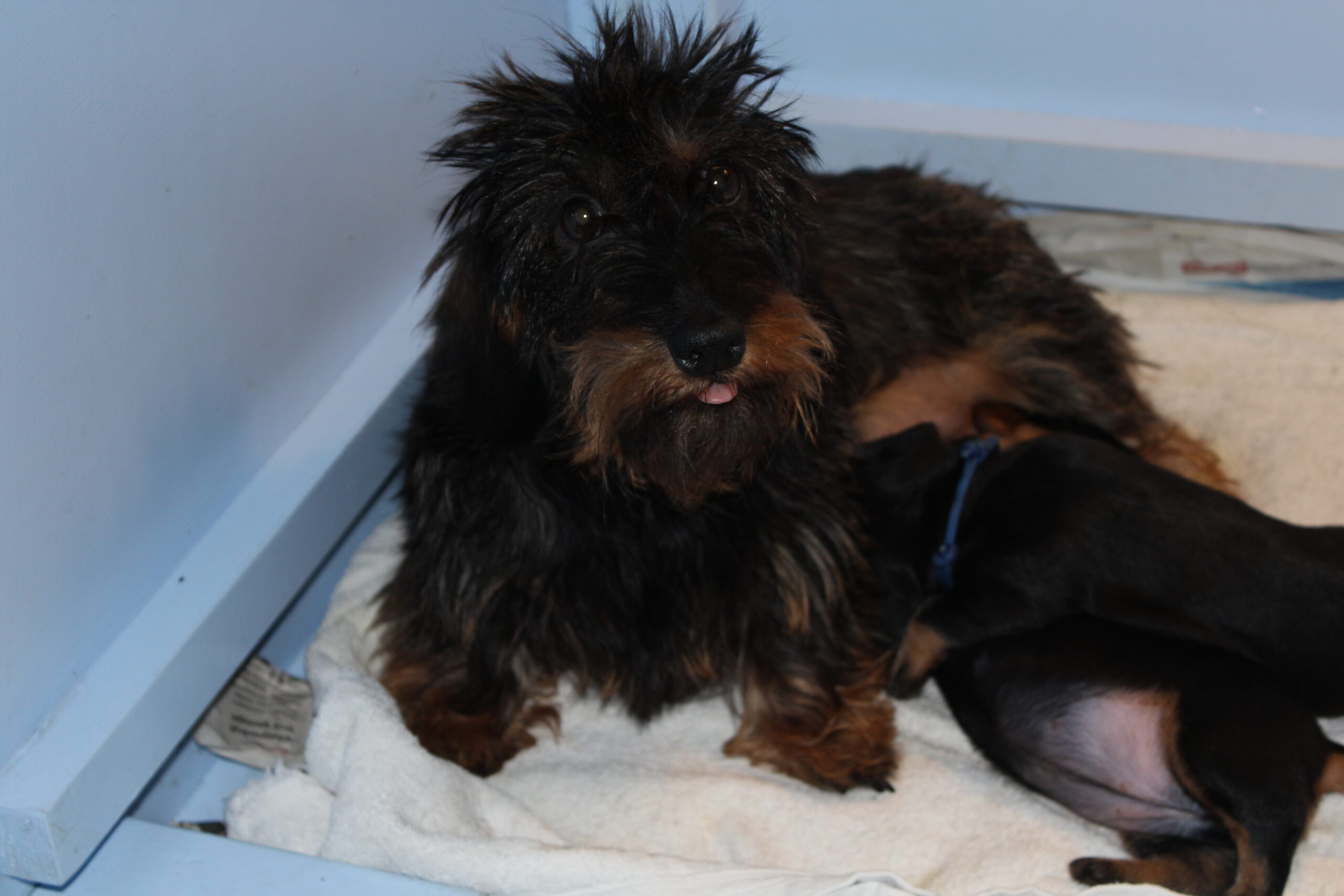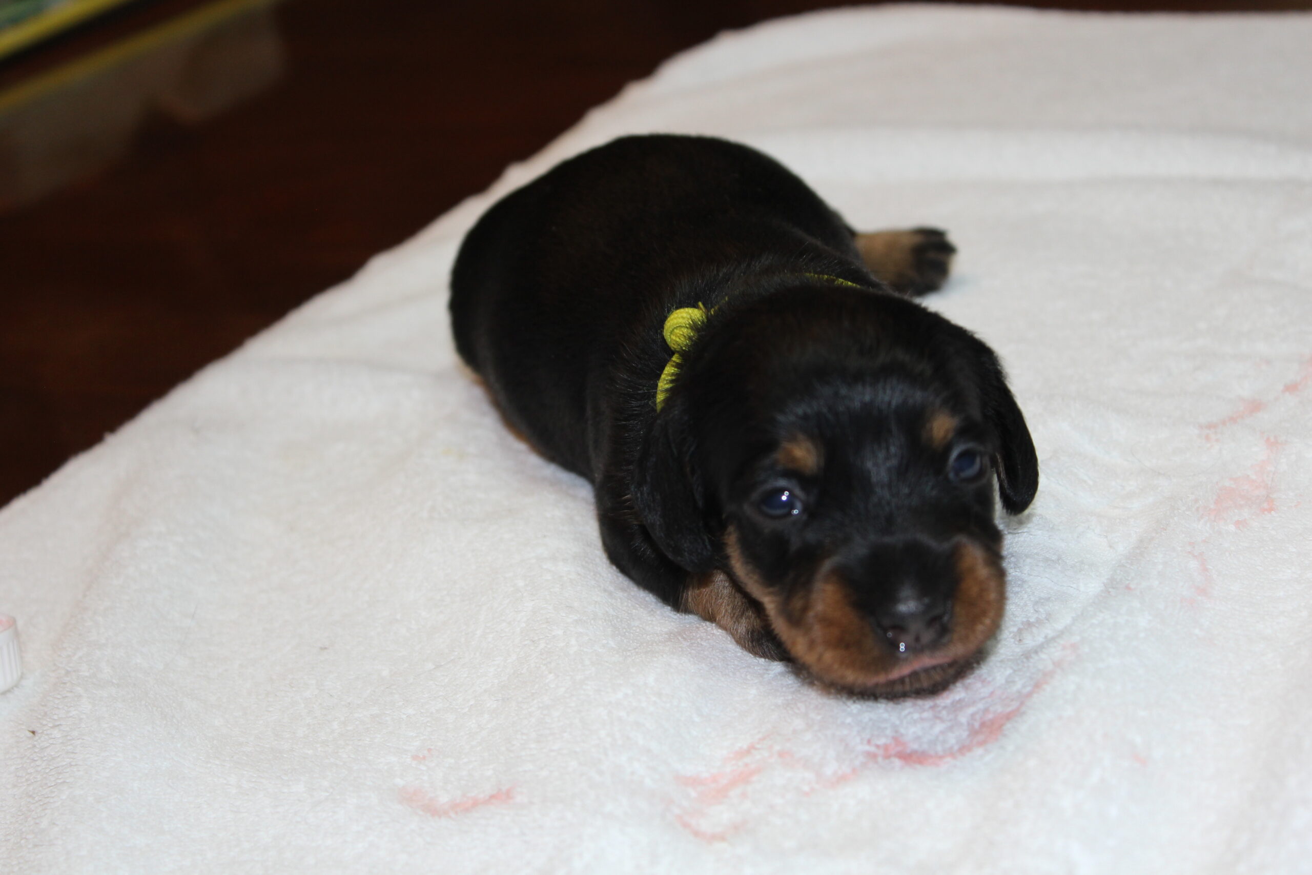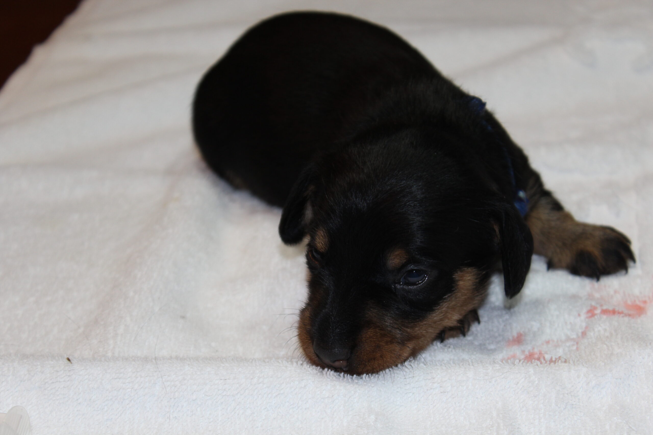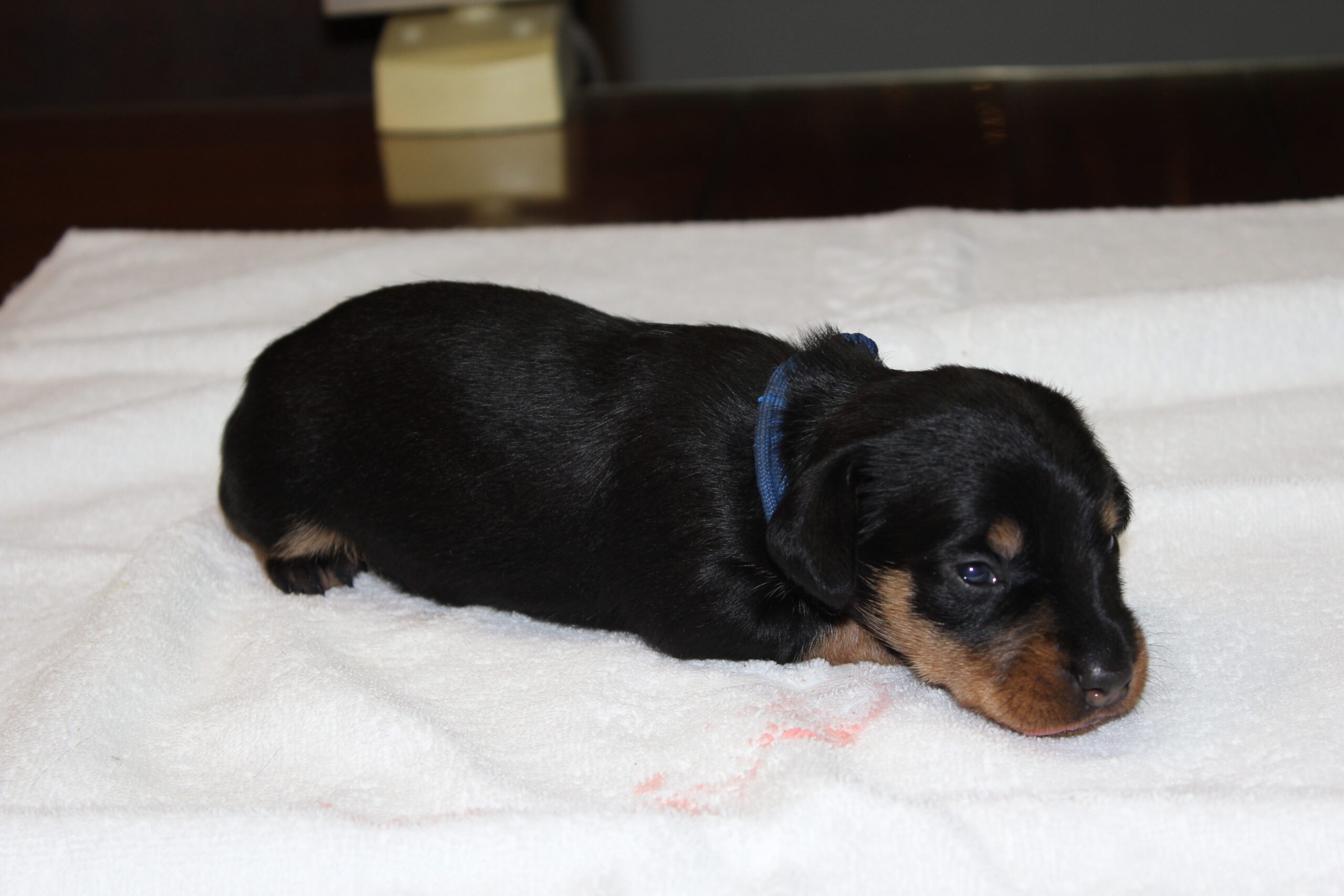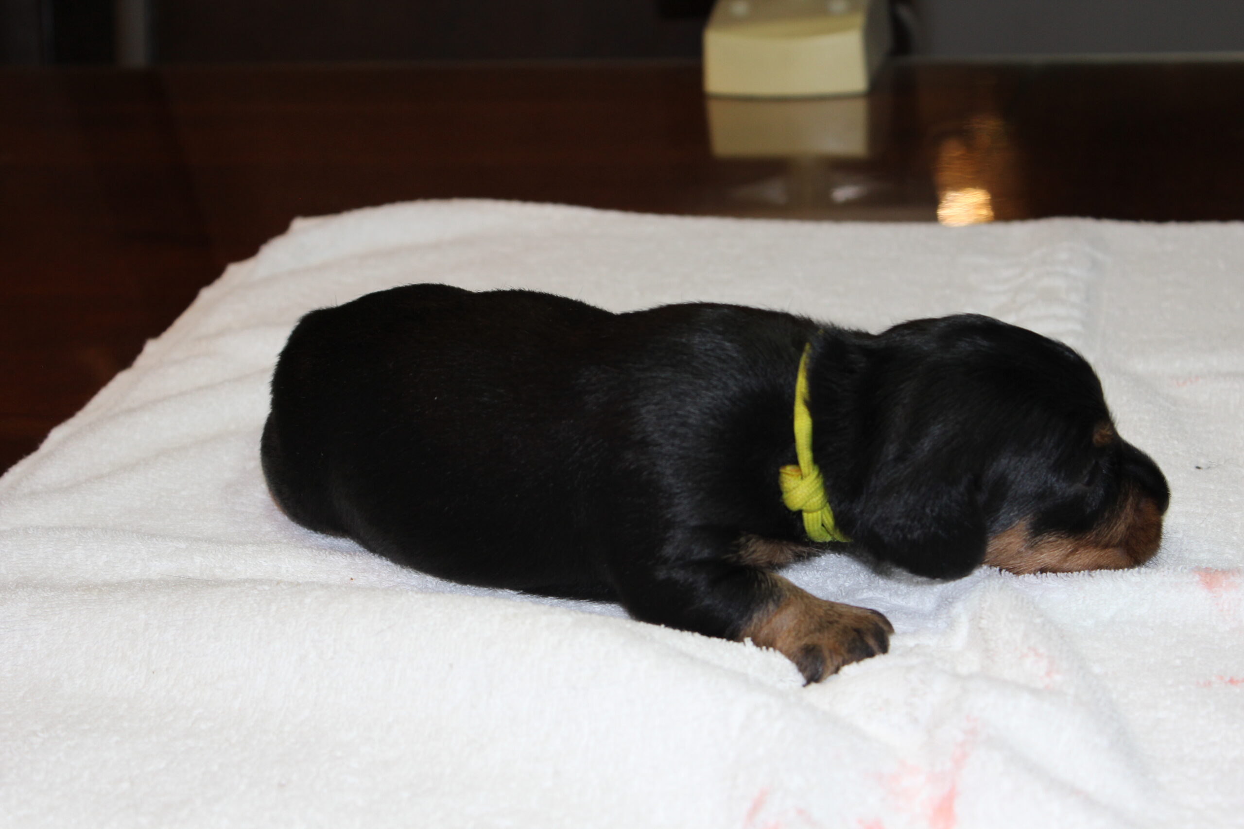 Hoe gaat het dat nu met de kleintjes zullen jullie vragen? In een woord geweldig. Ze groeien als kool. Namen hebben ze inmiddels ook al. Het reutje heet Tax en het teefje Muts. Zodra de oogjes en met name de oortjes open zijn, hetgeen rond de tweede week zal gaan gebeuren, zullen Bert en ik hen aanspreken met de naam, waardoor de kans bestaat dat ze de naam tegen de tijd dat de baasjes ze komen ophalen al kennen en er al een beetje naar luisteren. Let wel het zijn teckels en die hebben nog wel eens banaantjes in hun oren. Dus consequent zijn, is en blijft het devies.